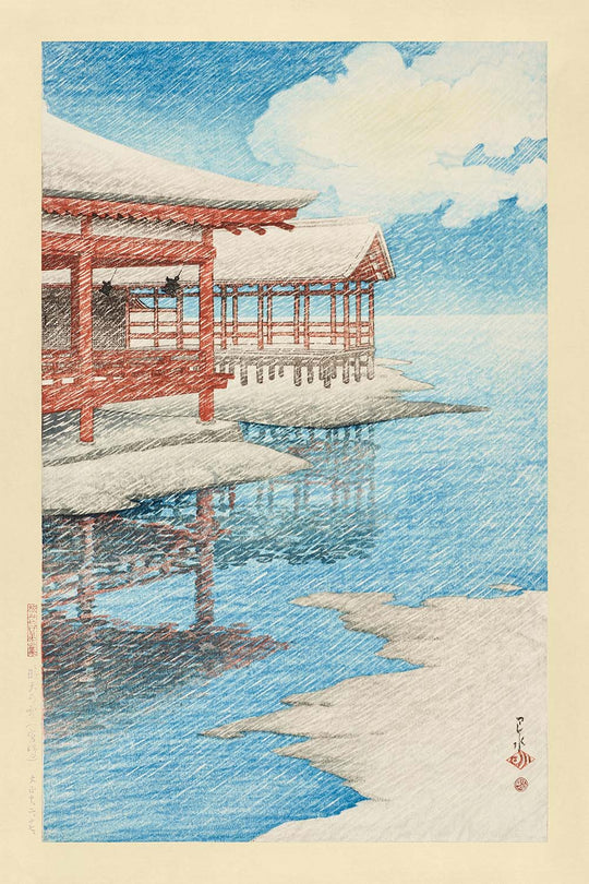 A Fine Winter's Sky & Snow in Miyajima by Hasui Kawase invites viewers into the tranquil, snowy landscape of Miyajima, Japan. Created in 1935, this masterful woodblock print—originally titled 宮島の雪 (Miyajima no Yuki) in Japanese—showcases the celebrated ukiyo-e tradition reimagined for the modern era. Hasui Kawase, a pivotal figure in twentieth-century Japanese art, was renowned for his moody landscapes and delicate attention to seasonality in nature.