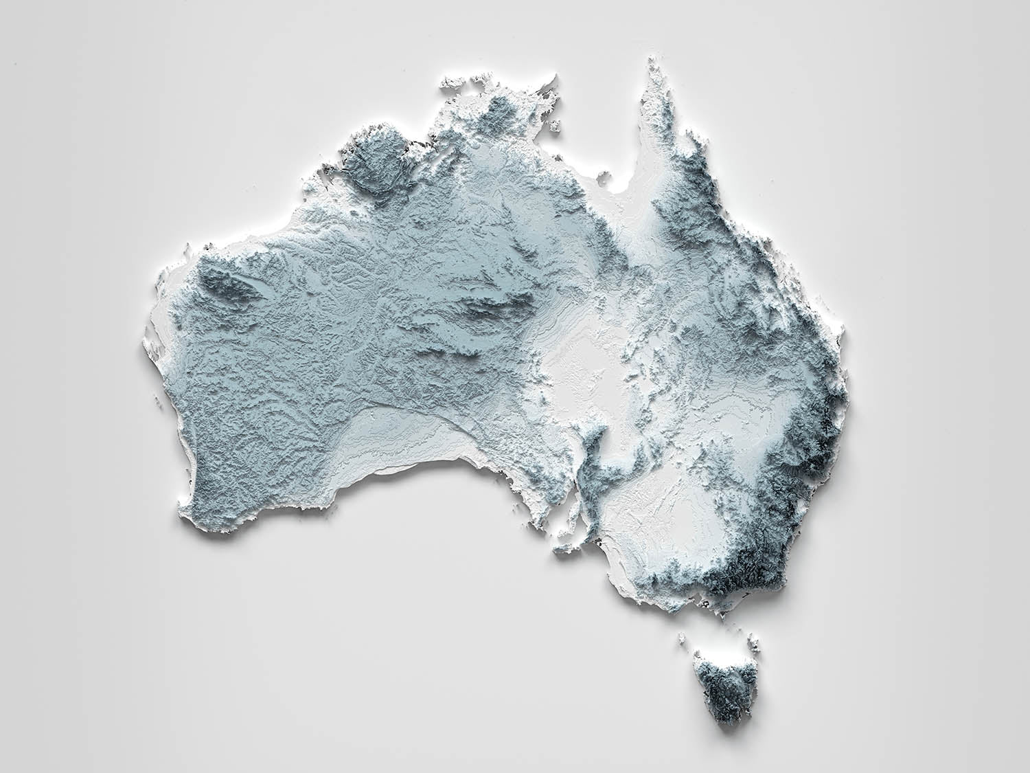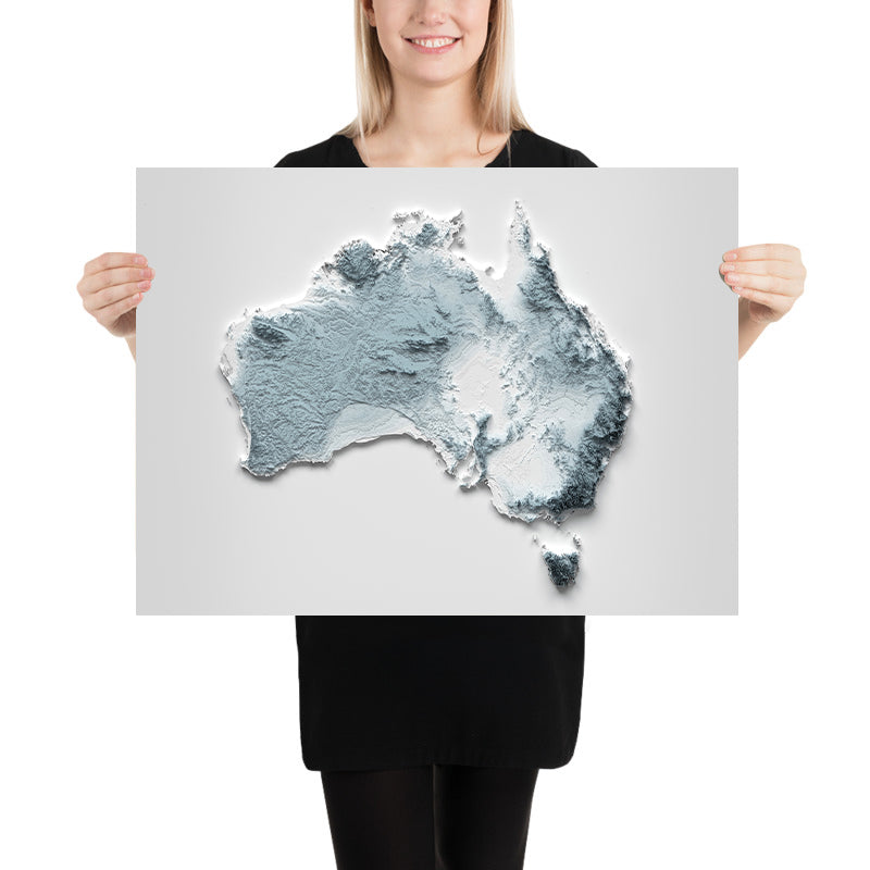For those who call Australia home, who have crossed it by road or rail, or who hold a memory of a favorite coastline, range, or desert, this minimalist relief invites instant recognition. Without a single label, the continent’s story unfolds through light and shadow — from coastal escarpments and snowy summits to river basins, plateaus, deserts, and island ranges — a tactile portrait ready to hang on any wall.