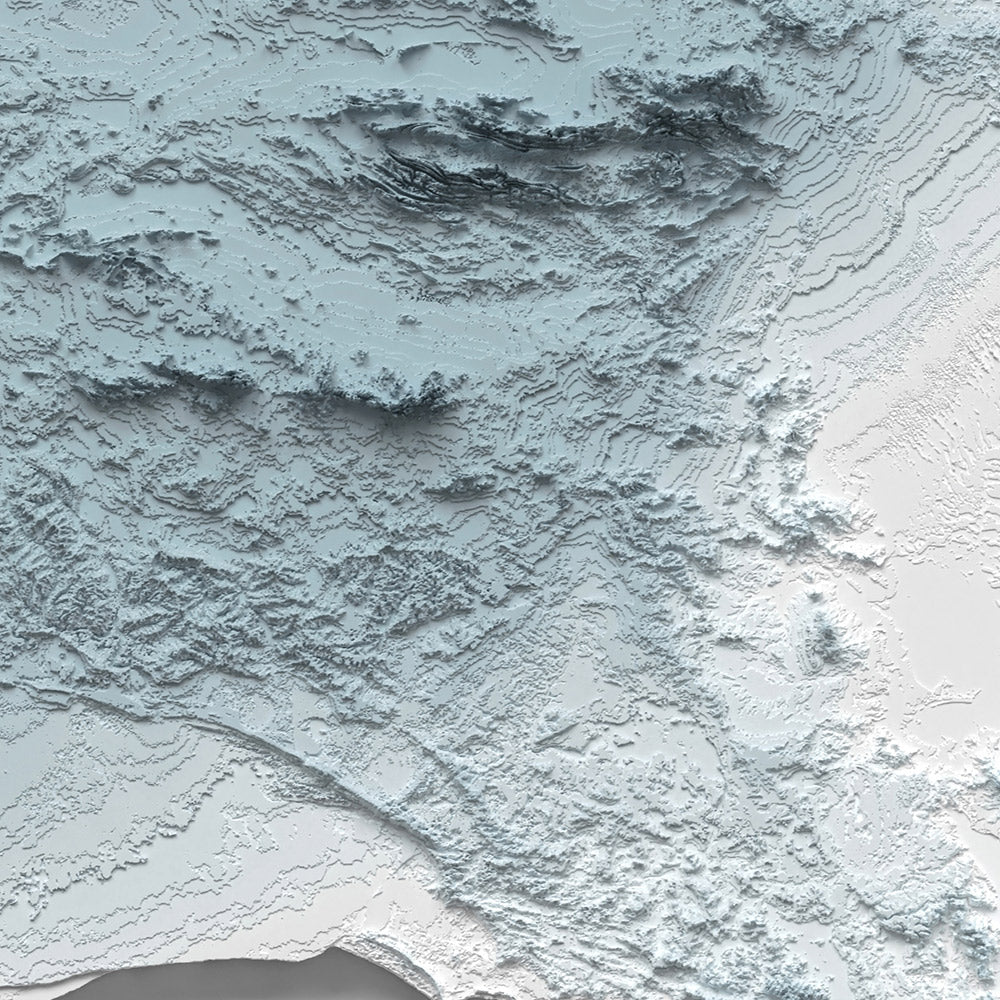 Our shaded relief prints use ultra high resolution topographic data and a secret 3D rendering process to create the illusion of raised terrain — like the mountains are about to lift right off the page. No labels, no borders, no distractions. Just the raw shape of the land, brought to life in a clean, modern style.