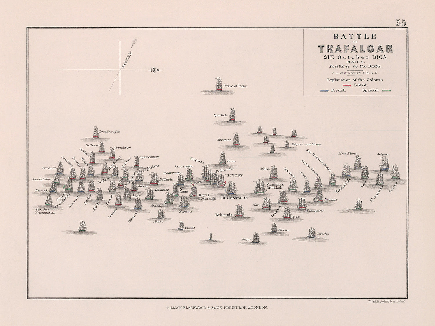 Battle of Trafalgar: Positions in the Battle by AK Johnston, 1852: Napoleonic Wars, Admiral Nelson