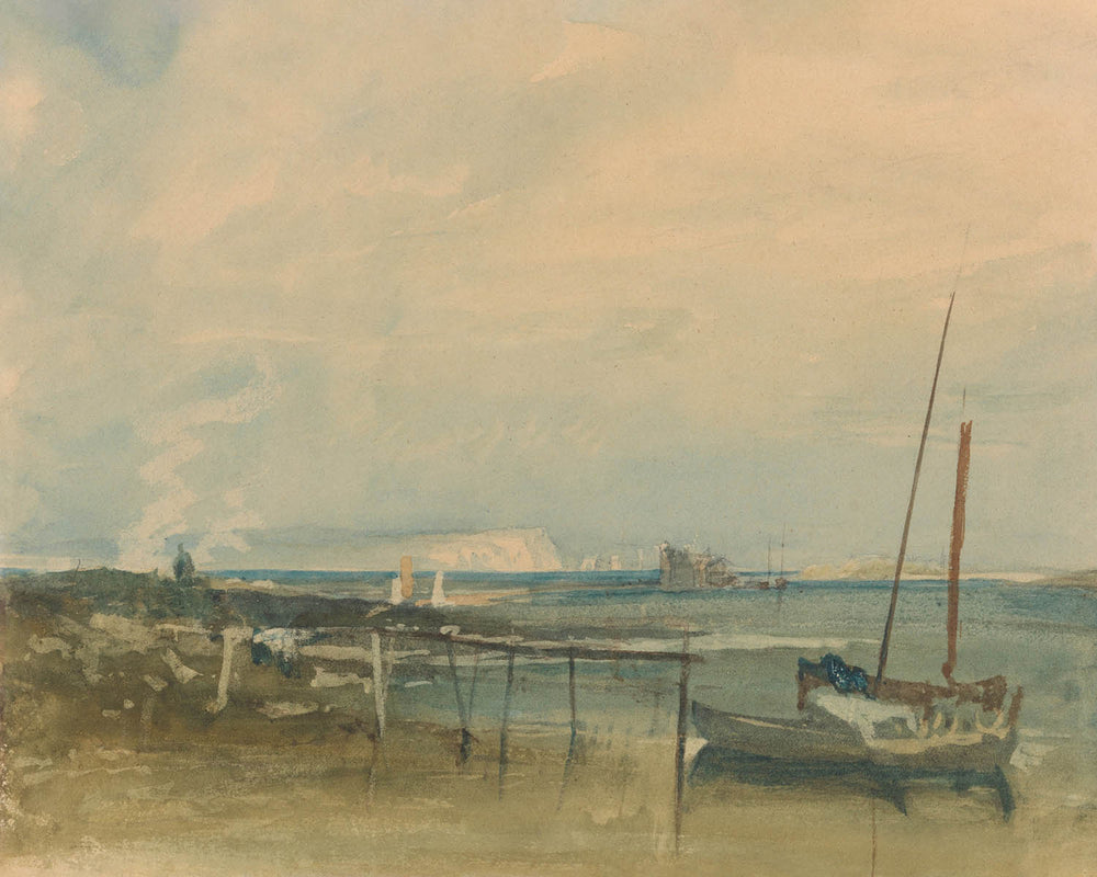 Coast Scene with White Cliffs (1800) by Joseph Mallord William Turner captures the restless beauty of Britain’s shoreline at the dawn of the 19th century. One of the leading figures of Romanticism, Turner channels atmosphere and emotion into a luminous seascape where pale cliffs rise over a tidal strand dotted with working boats. The scene likely evokes the chalk headlands of England’s south coast, distilled into shimmering light, shifting weather, and the human drama of life at the water’s edge. It’s an early glimpse of the mastery that would earn Turner the epithet “the painter of light.”