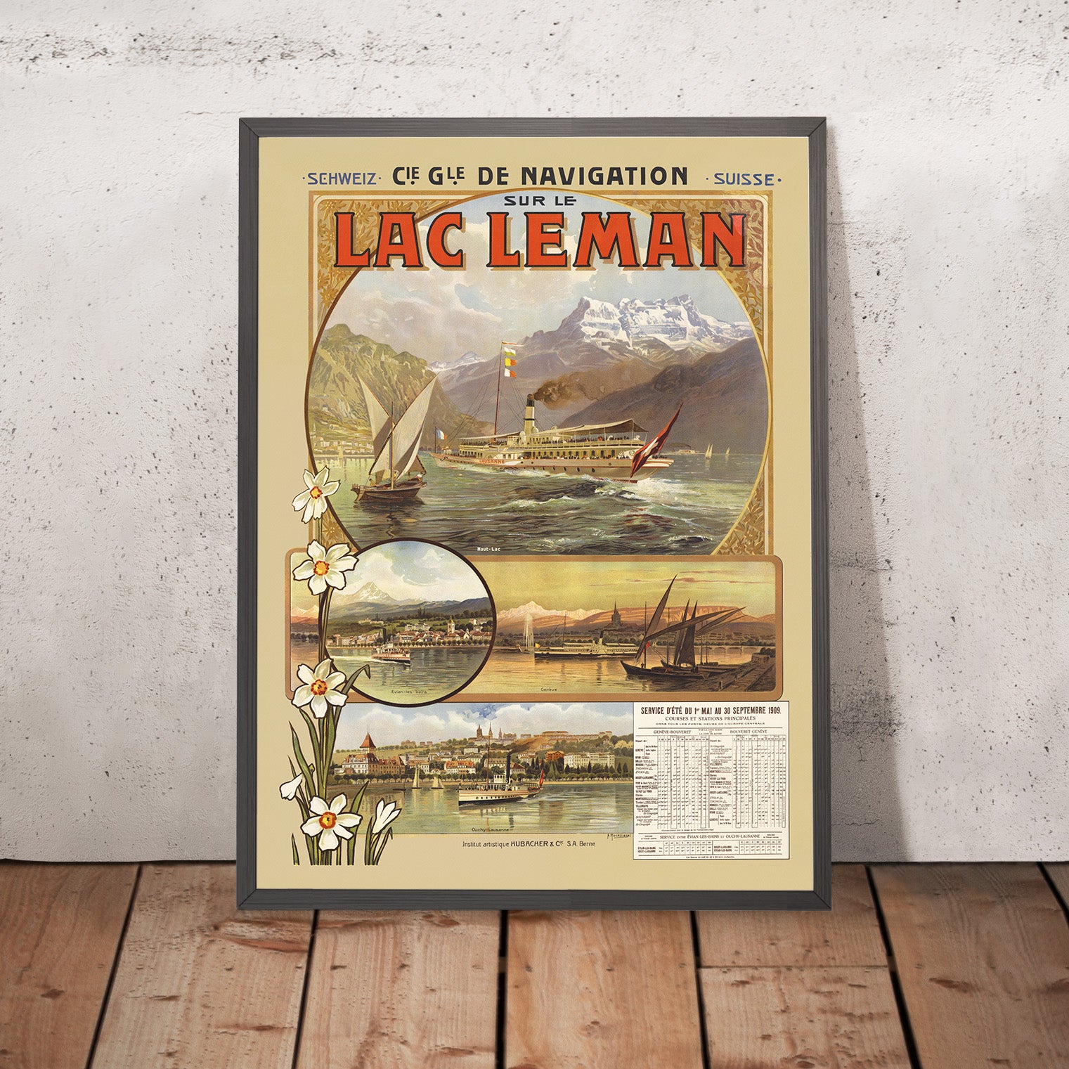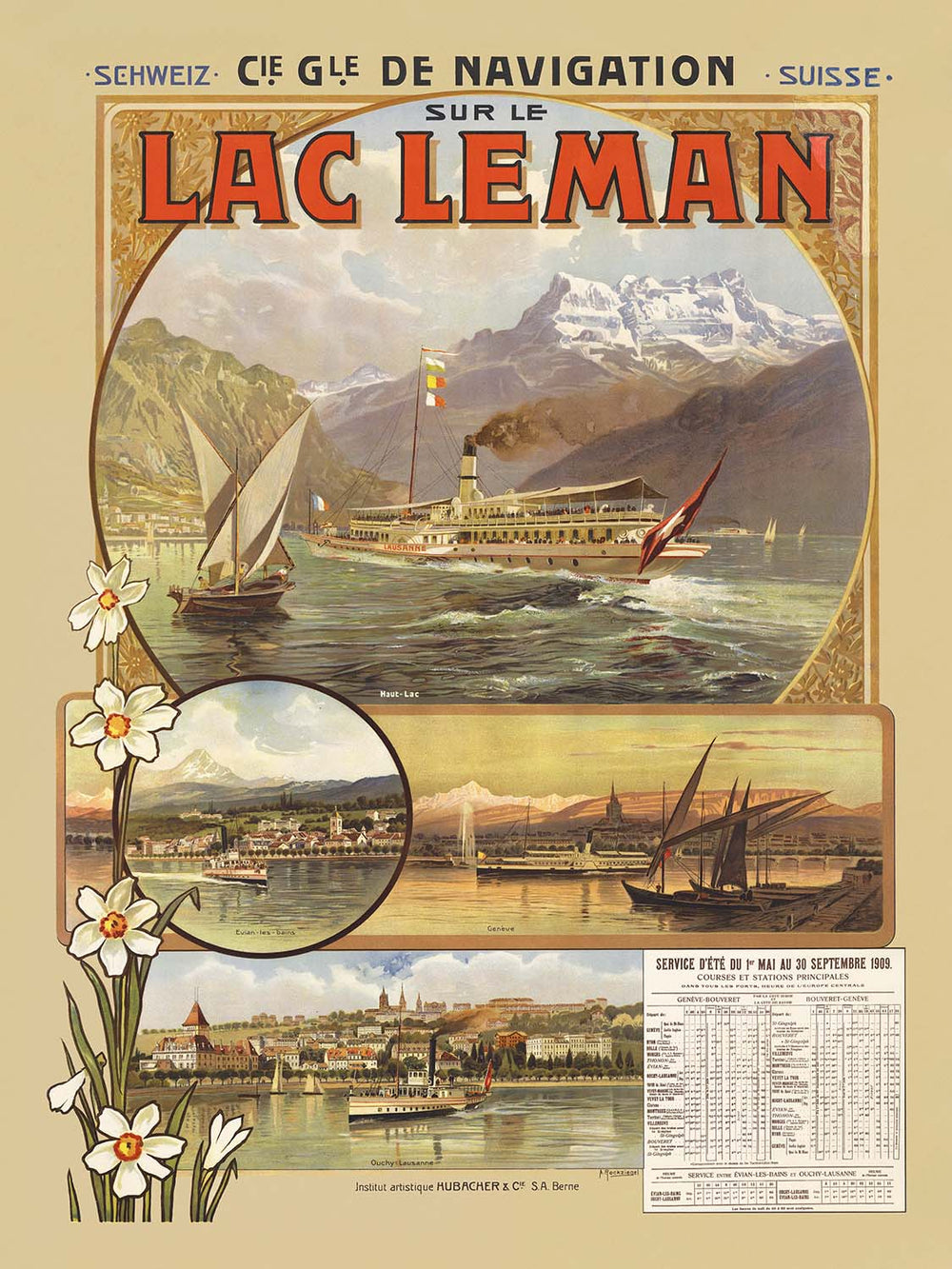 Cie. Gle. de Navigation sur le Lac Léman (1909) by Anton Reckziegel is a quintessential Belle Époque travel poster celebrating the Compagnie Générale de Navigation and the timeless allure of Lake Geneva. Designed at a moment when elegant steamers stitched together the lake’s shoreline towns, this French-language poster evokes the romance of journeys between Geneva, Lausanne, Vevey, and Montreux amid crisp mountain air and glittering water. In the composition, a broad band of lake blue anchors the lower half while a sunlit, yellow-tinged sky opens above—an eye-catching contrast that instantly summons memories of Léman’s luminous horizons.