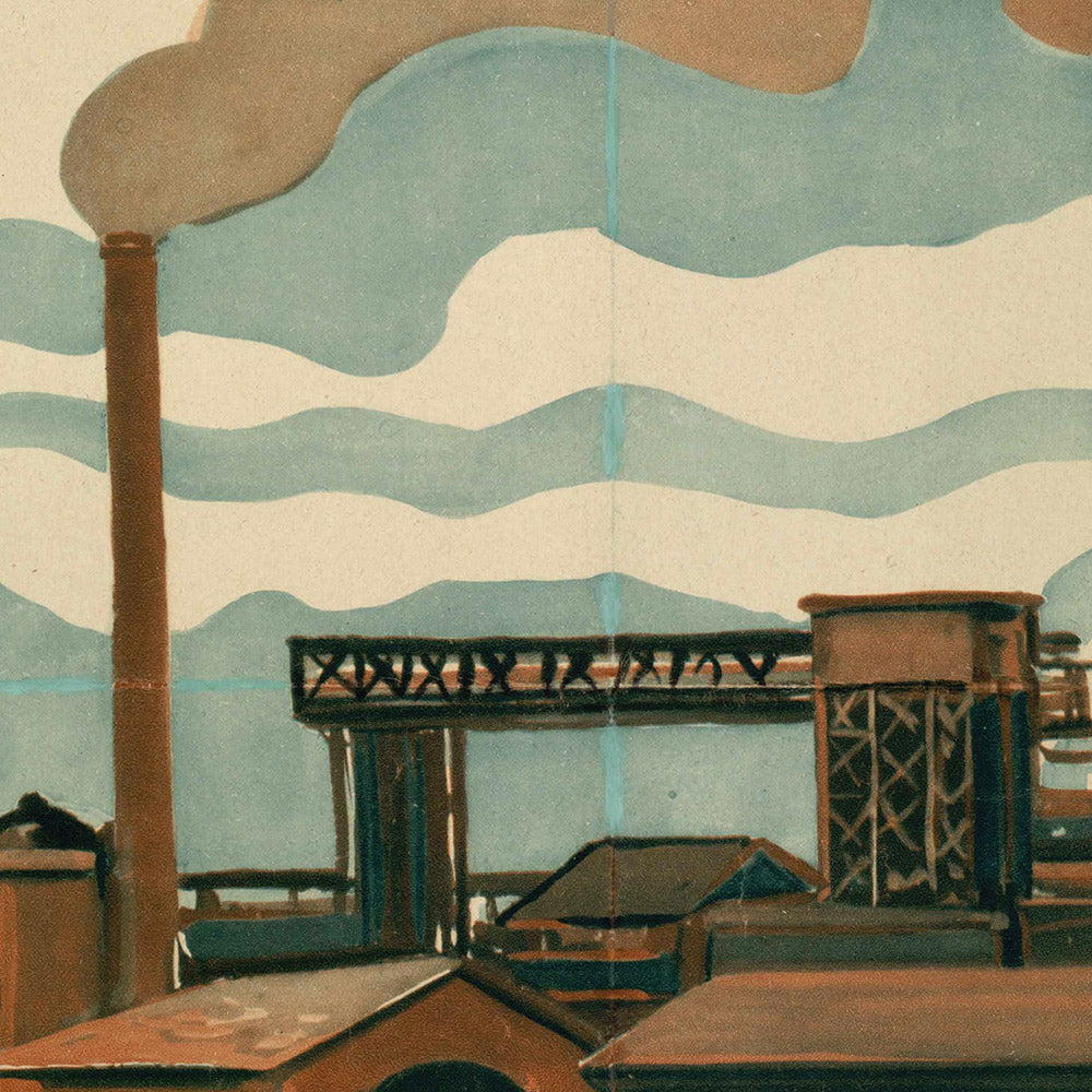 Style and color you’ll love: Chevalier uses an Art Deco-inflected vocabulary—clean geometry, crisp contours, and simplified forms—tempered by organic silhouettes of foliage and cloud. A confident palette of green, brown, and orange, supported by muted blues and earth tones, draws the eye from factory outlines to hillside contours, creating a rhythm between industry and nature. Bold outlines and smooth gradients give the scene a poster-like clarity that feels both vintage and sophisticated, making it an effortless focal point in contemporary interiors.