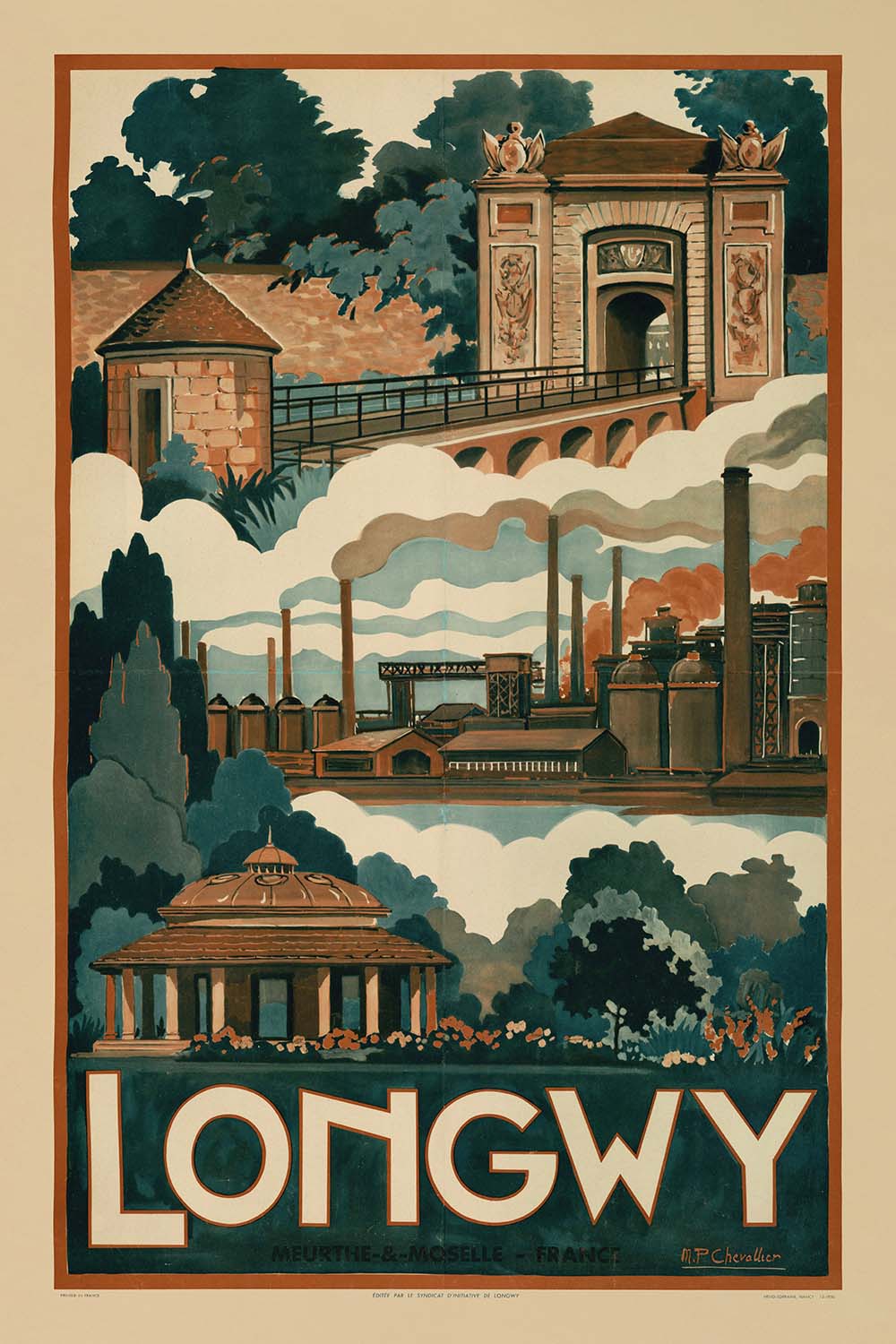 Longwy, Meurthe-et-Moselle – France by Maurice-Paul Chevalier captures the spirit of a storied border town in France’s Lorraine region at mid-century. Created in 1950, this vintage travel poster blends the optimism of postwar modernity with the romance of northern French landscapes. Chevalier’s design language—streamlined, geometric, and gently idealized—places Longwy’s industrial might alongside its pastoral setting, inviting the viewer to see progress and beauty as companions rather than rivals.