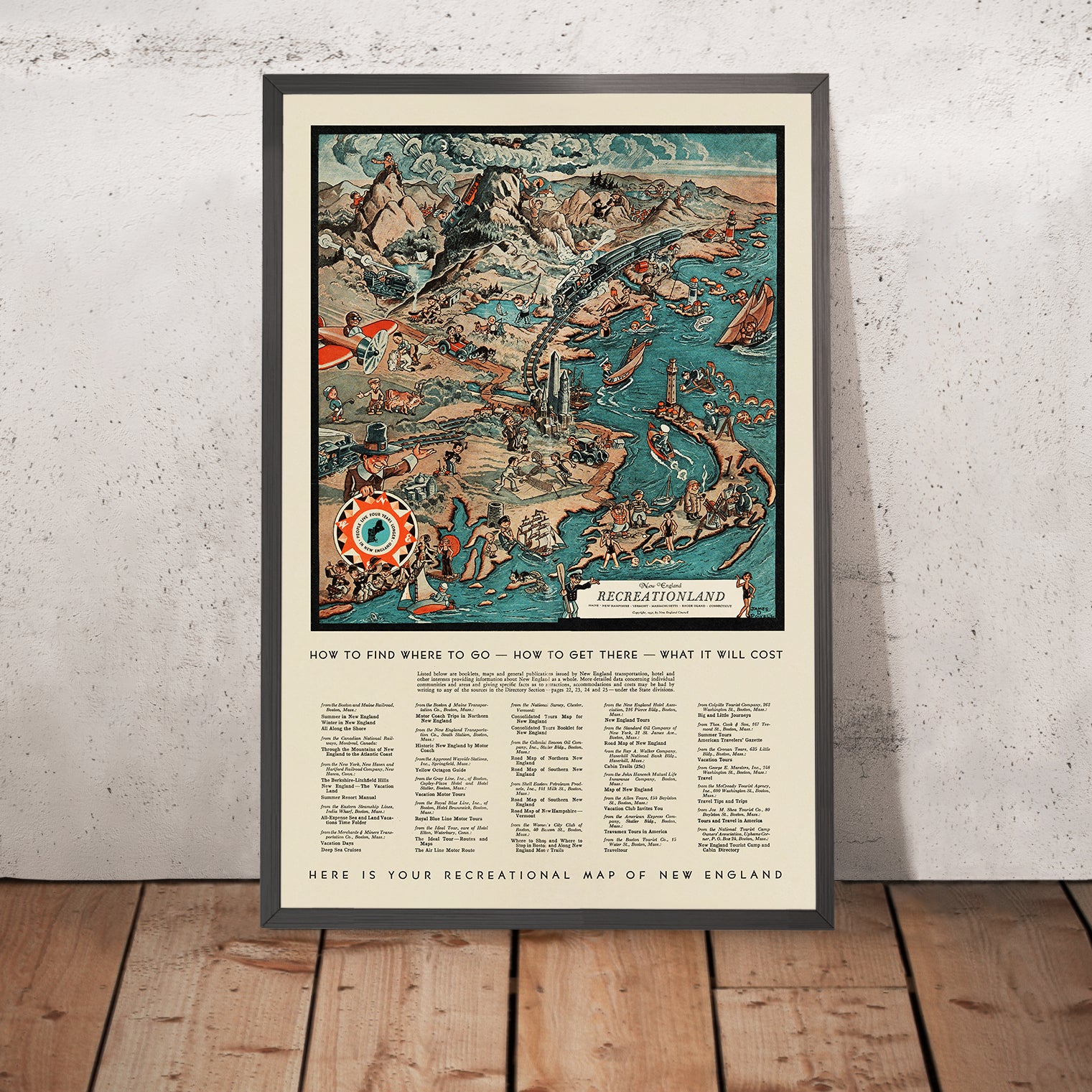 This poster’s subject is New England itself: a region of storied seacoasts and inland retreats, rendered here as a lively “recreationland.” It embodies the optimism of postwar American travel, when families set out to discover lighthouses, historic towns, beaches, and wooded hills in a single sweeping itinerary. True to the period’s practical-meets-playful design ethos, the artwork integrates informative text along the bottom, offering helpful travel details to complement the visual tour.