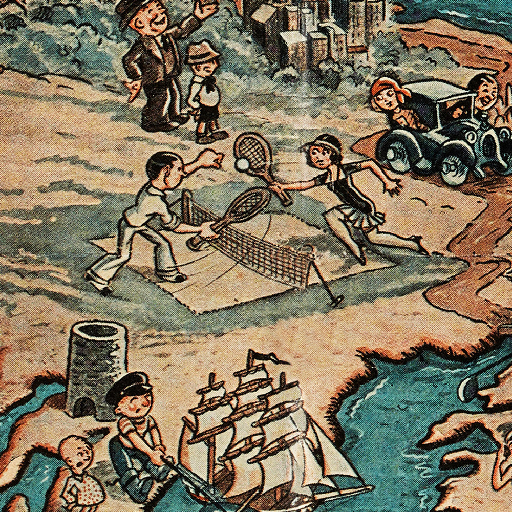John Held, Jr. was a pioneering American cartoonist, printmaker, illustrator, sculptor, and author—best known for his iconic 1920s magazine work. From early beginnings as a teenage illustrator at The Salt Lake Tribune to his celebrated friendship with Harold Ross of The New Yorker, Held brought a distinctive, witty visual language to the pages of The New Yorker, Vanity Fair, Harper’s Bazaar, and Life. His instantly recognizable style—sprightly figures, brisk lines, and a flair for contemporary culture—translates beautifully to travel promotion and pictorial cartography.