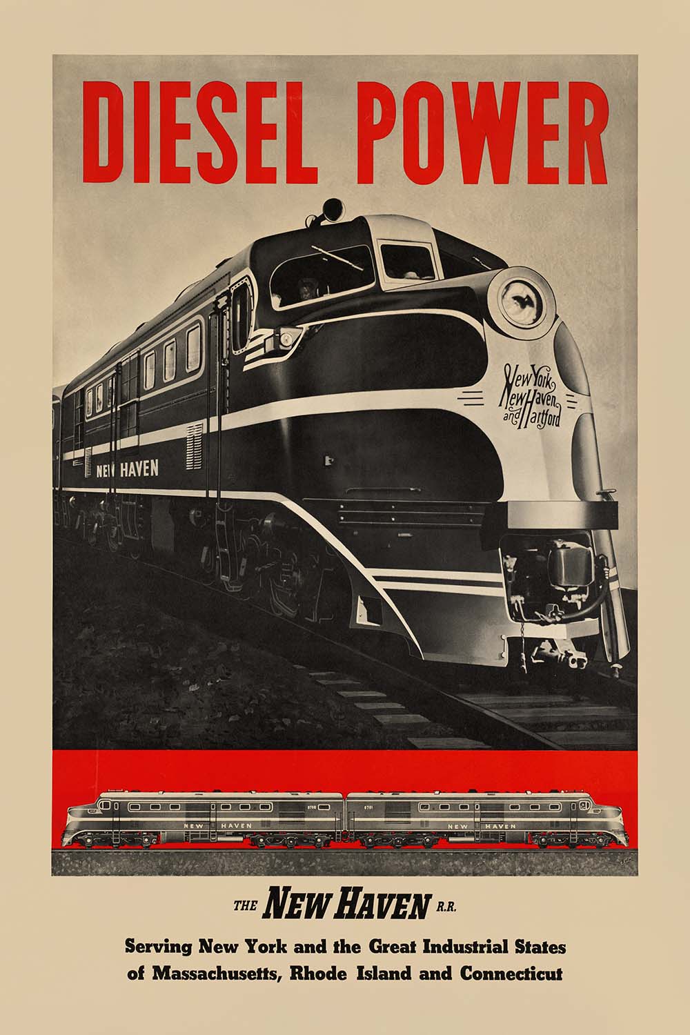 “Diesel Power” celebrates the New York, New Haven and Hartford Railroad at the height of American streamliner pride. The original artist is unknown, but the work clearly comes from the railroad’s publicity department during the mid‑century transition to diesel‑electric traction. Centered on a dramatic, close‑cropped view of a streamlined locomotive lettered NEW HAVEN, the poster proclaims the railroad’s reach across New York and the industrial states of Massachusetts, Rhode Island, and Connecticut—an irresistible slice of Northeastern travel history.