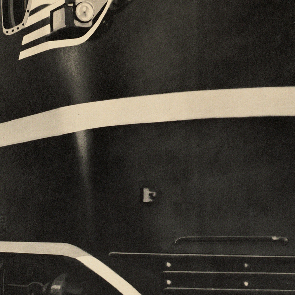 Design and color: a commanding red headline spans the top, while the train’s nose surges diagonally into the frame, its white pinstripes and reflective panels carved against deep black. A vivid red band grounds the composition at the bottom, where a small side‑view silhouette of the full train glides along the track. The warm beige field around the image gives the print a gallery‑ready calm that balances its industrial power—ideal for interiors that favor bold mid‑century graphics and a confident palette of red, black, and cream.
