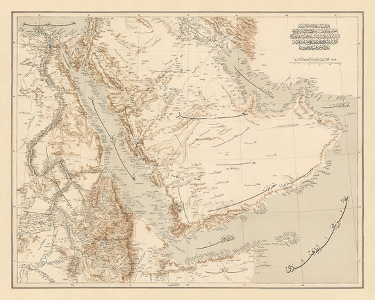 Old Arabic Map of Arabian Peninsula by the Ottoman Army, 1897: Saudi Arabia and Iraq, Persian Gulf, UAE, Dubai, Red Sea