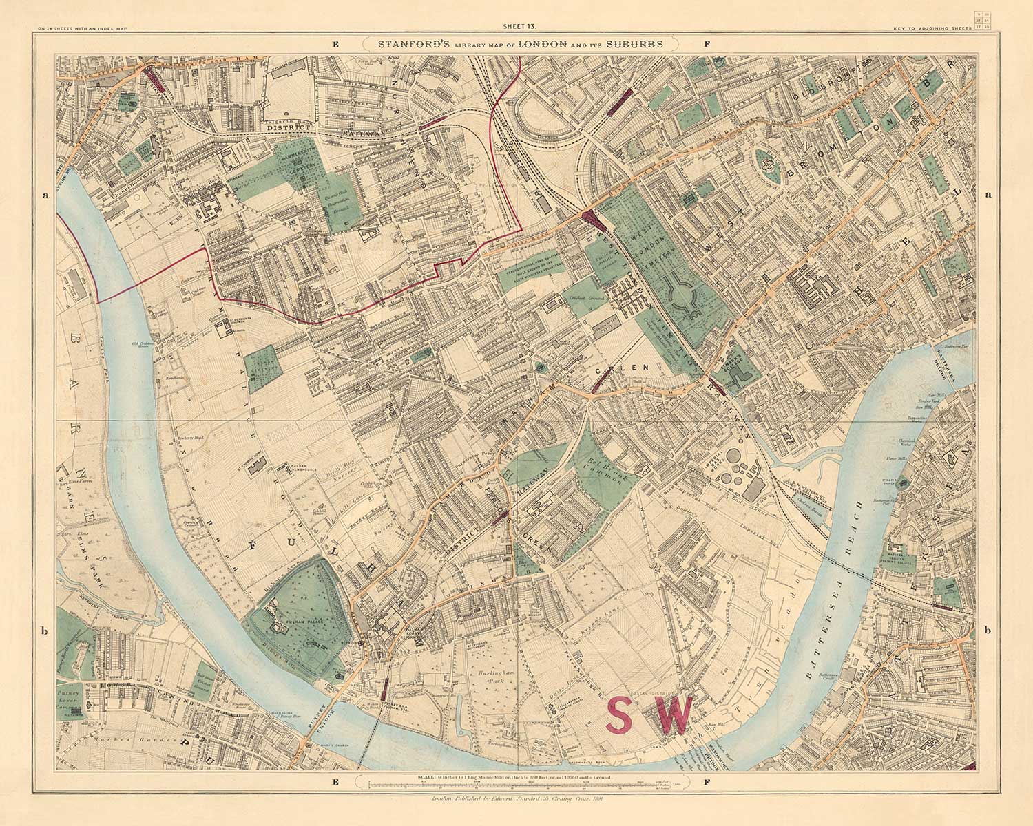The map was originally published in 24 sheets. Altogether the map would've measured about 2 metres wide (78 inches). This here is sheet 13, which focuses on West London, specifically Fulham and West Brompton, with bits of Hammersmith, Chelsea, Battersea and Putney.