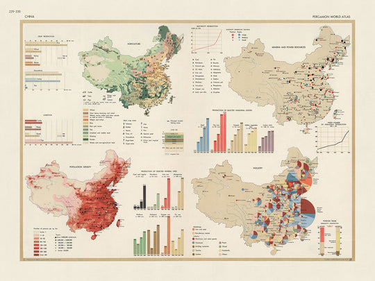 The map's main focus is on China, with additional subjects such as agriculture, crops, livestock, land use, population, minerals, industry, mineral and power resources, electricity, and foreign trade. These subjects are meticulously organized and presented through a series of thematic maps and infographics, allowing readers to gain a comprehensive understanding of China's economic development during this pivotal period.