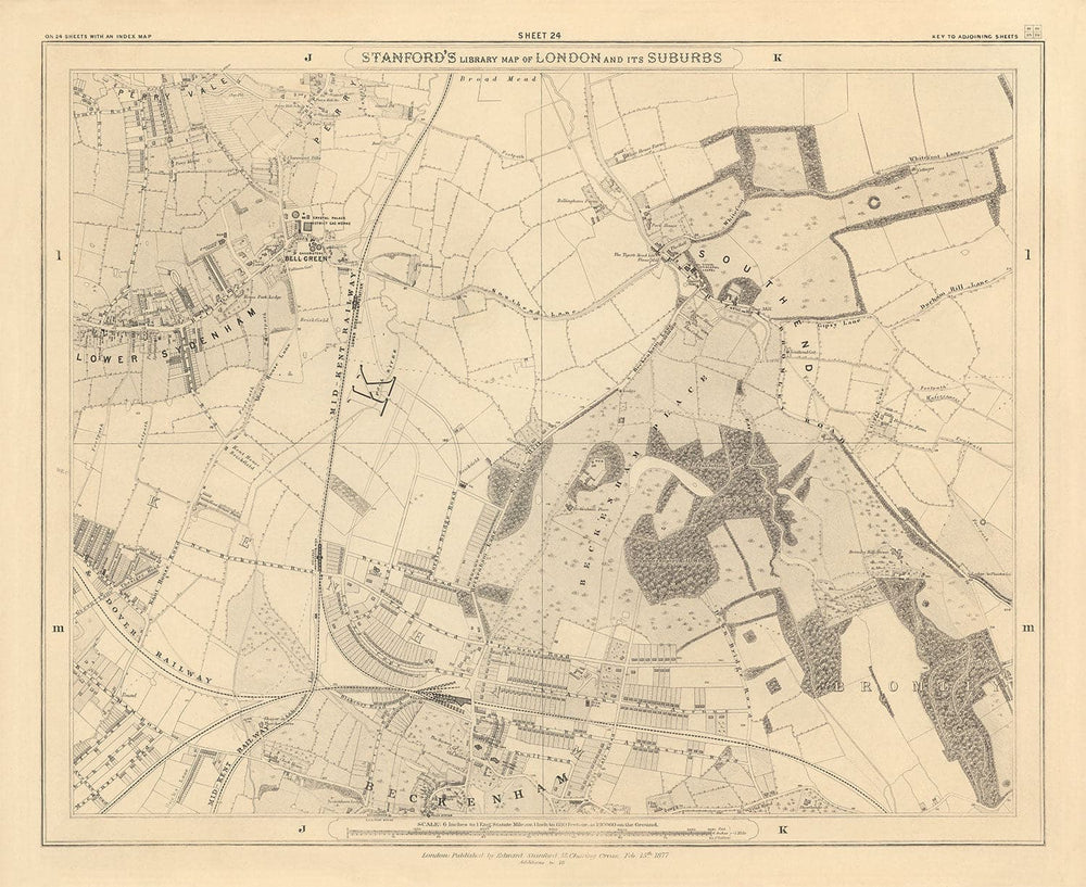 The map was originally published in 24 sheets. Altogether the map would've measured about 2 metres wide (78 inches). This here is sheet 24, which focuses on the southeast London boroughs of Bromley, Lewisham and Southwark.