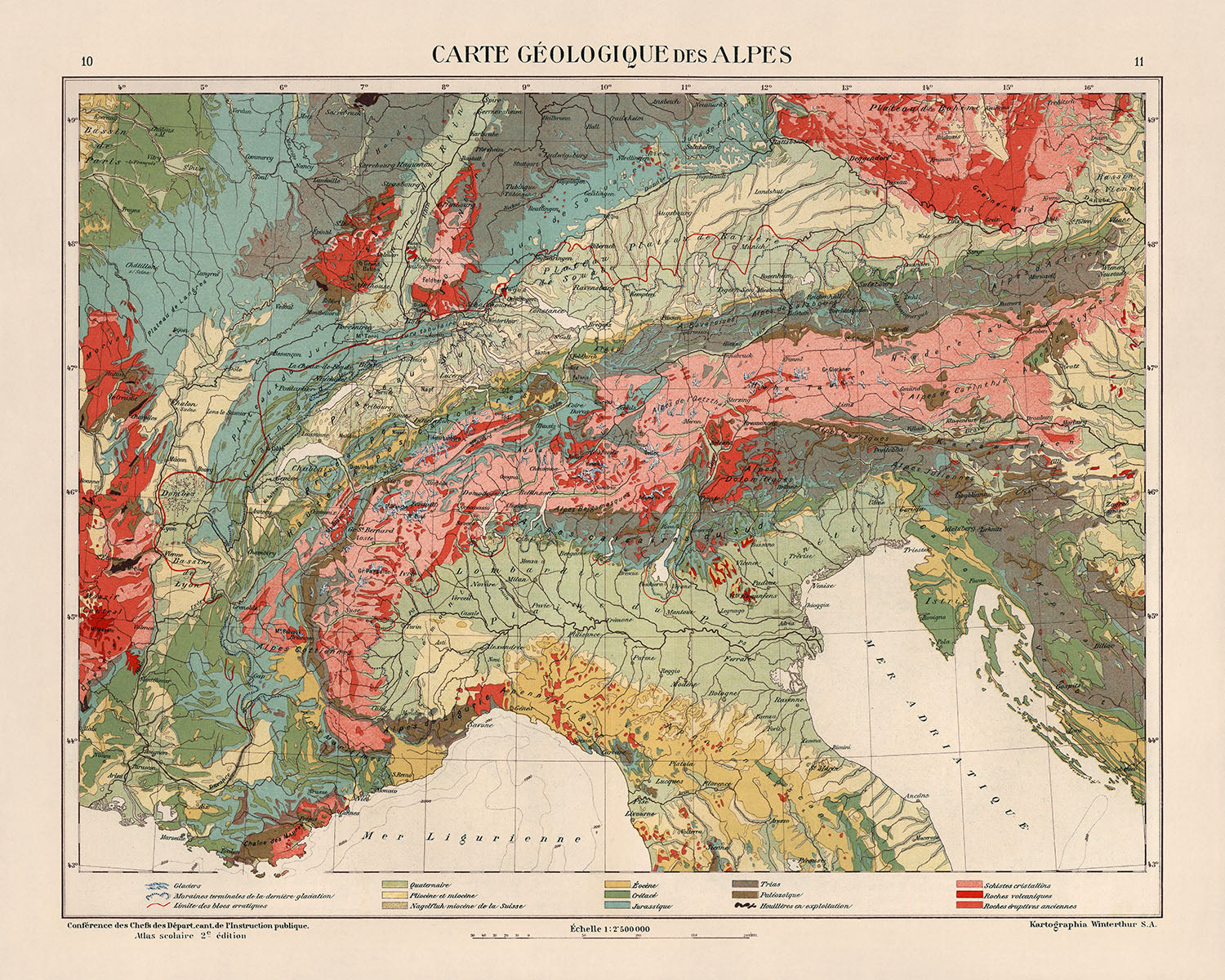 Kartographia Winterthur, the publisher of this map, is known for their commitment to accuracy and detail. Their expertise in the field of cartography is evident in the 'Carte geologuique des Alpes'. The map is a testament to their skill and dedication, providing a wealth of information on the geology of the Alps, as well as the political and physical landscape of the countries that the mountain range traverses. This map is not just a tool for understanding the geography of the Alpine region, but also a work of art that reflects the publisher's passion for cartography.