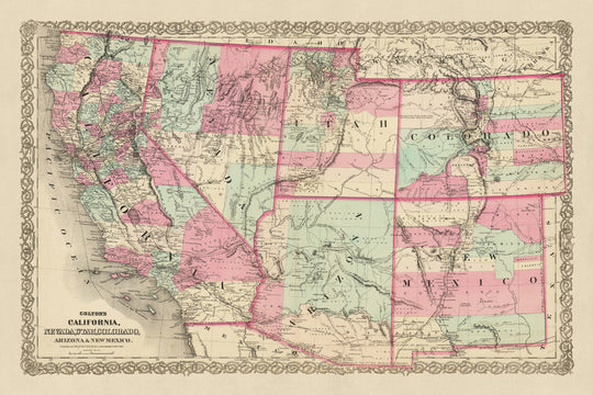 Step back in time with this beautifully detailed old map of California, Nevada, Utah, Colorado, and Arizona & New Mexico, created by J.H. Colton in 1871. Colton, widely regarded as the finest American mapmaker of his era, meticulously captured the landscape of the Western United States in the early years of the country's history. This map is a testament to his talent and a fascinating snapshot of a time when the region was still largely uncharted and continuously evolving.