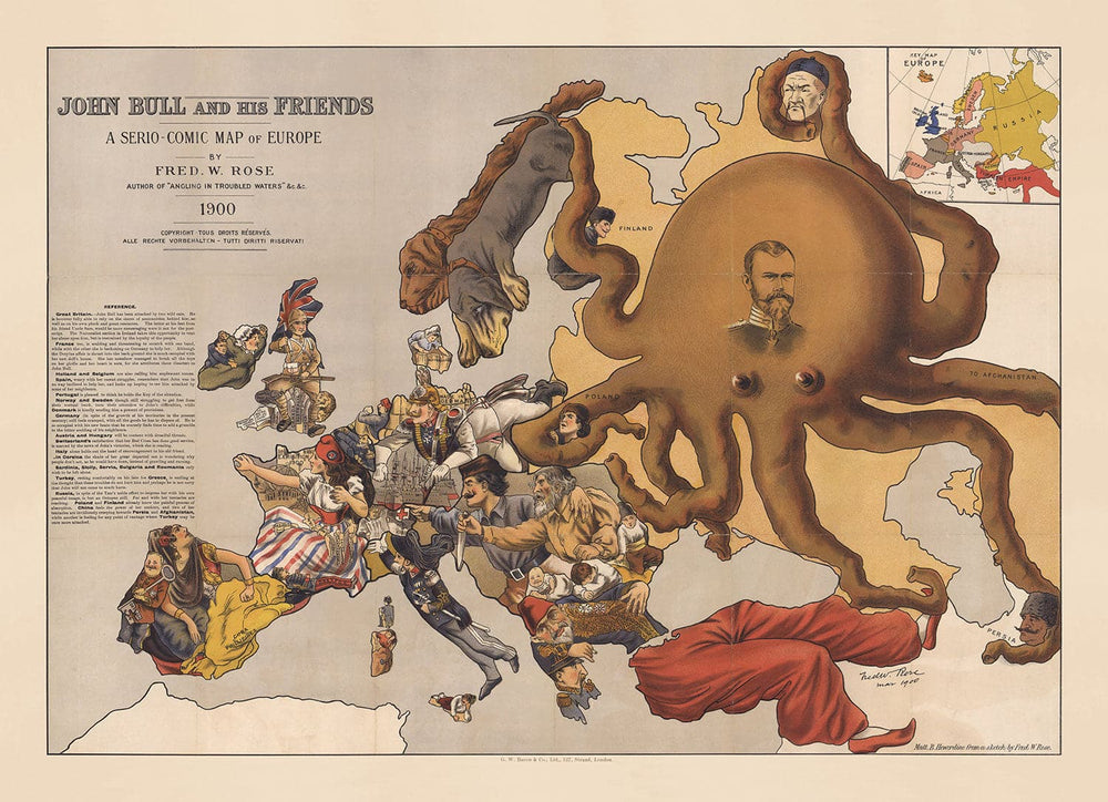 Rose published a series of European socio-comic maps, starting in 1877. Each one depicts the state of Europe at the time, if you look closely at the interactions between the animals, people and objects.