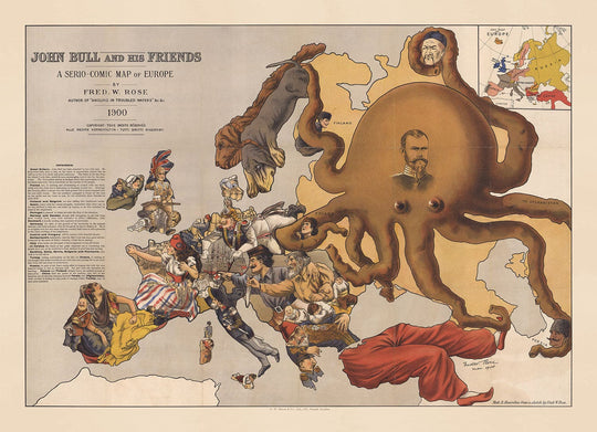 Old Satirical Map of Europe, 1900 by Fredrick Rose: John Bull Propaganda Serio-Comic, Octopus Nikolai II Russian Empire