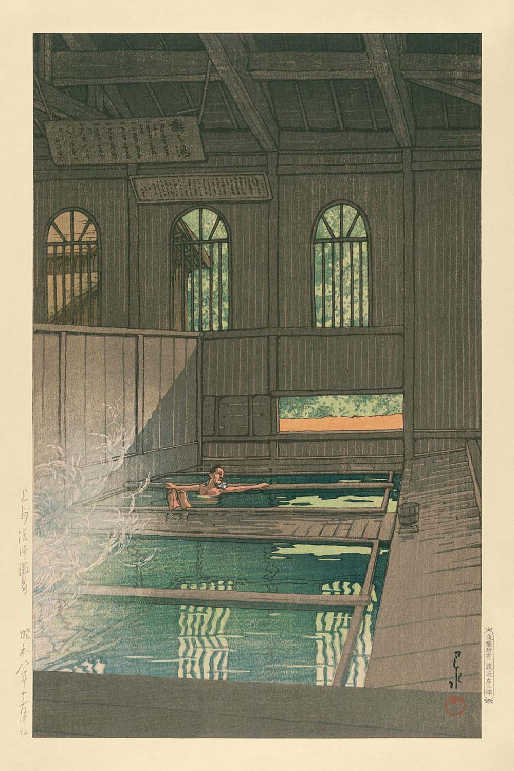 Onsen Bath and Relaxing Man by Hasui Kawase is a stunning woodblock print created in 1935, capturing the tranquil essence of a traditional Japanese hot bath. Known for his significant contributions to the Shin-Hanga movement, Hasui Kawase's works are celebrated for their serene and atmospheric beauty, blending Western artistic influences with traditional Japanese techniques.