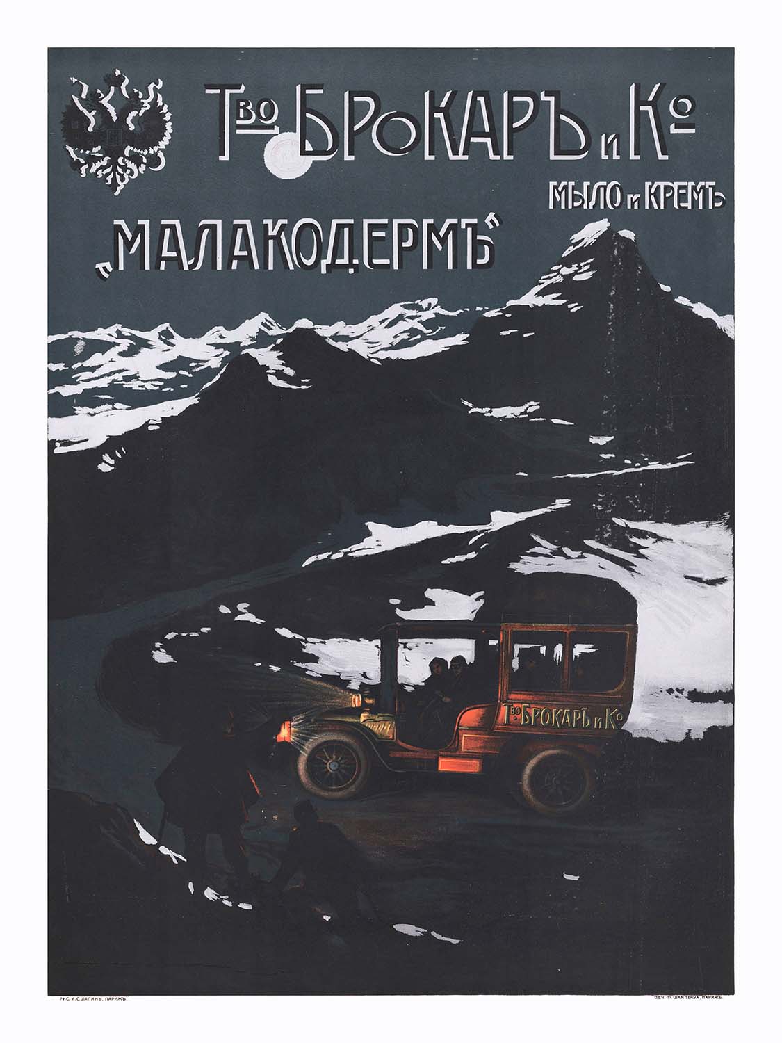Louis Tauzin’s 1909 Entreprise Brokar & Cie – Savon et crème – ‘Malakoderm’ is a dramatic Belle Époque advertising poster with the soul of a travel scene. In moonlit blues and inky blacks, a jagged Alpine peak rises above a serpentine mountain road as a red touring car rounds the bend—its headlamps throwing a warm cone of light onto two shadowy figures at the roadside. Cyrillic lettering and the double‑headed imperial eagle identify the Russian perfumery Brokar & Co., while the product name “Малакодермъ” (Malakoderm—literally “soft skin”) glows across the night sky. The setting, with its unmistakably pyramidal summit, closely recalls the Matterhorn above Zermatt, evoking the romance of early travel in the high Alps.