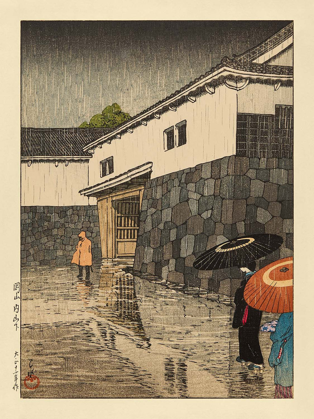 Introduce your collection to the timeless Japanese aesthetic with "Uchiyamashita in the Rain" by Hasui Kawase, originally titled 内山下の雨 (Uchiyamashita no Ame). Created in 1935, this woodblock print exemplifies Kawase's mastery of atmospheric poetics through the medium of shin-hanga – Japan's revivalist woodblock movement. Hasui Kawase stands as one of Japan's most celebrated printmakers, renowned for blending traditional ukiyo-e techniques with the emotion, subtlety, and realism inspired by changing weather and light.
