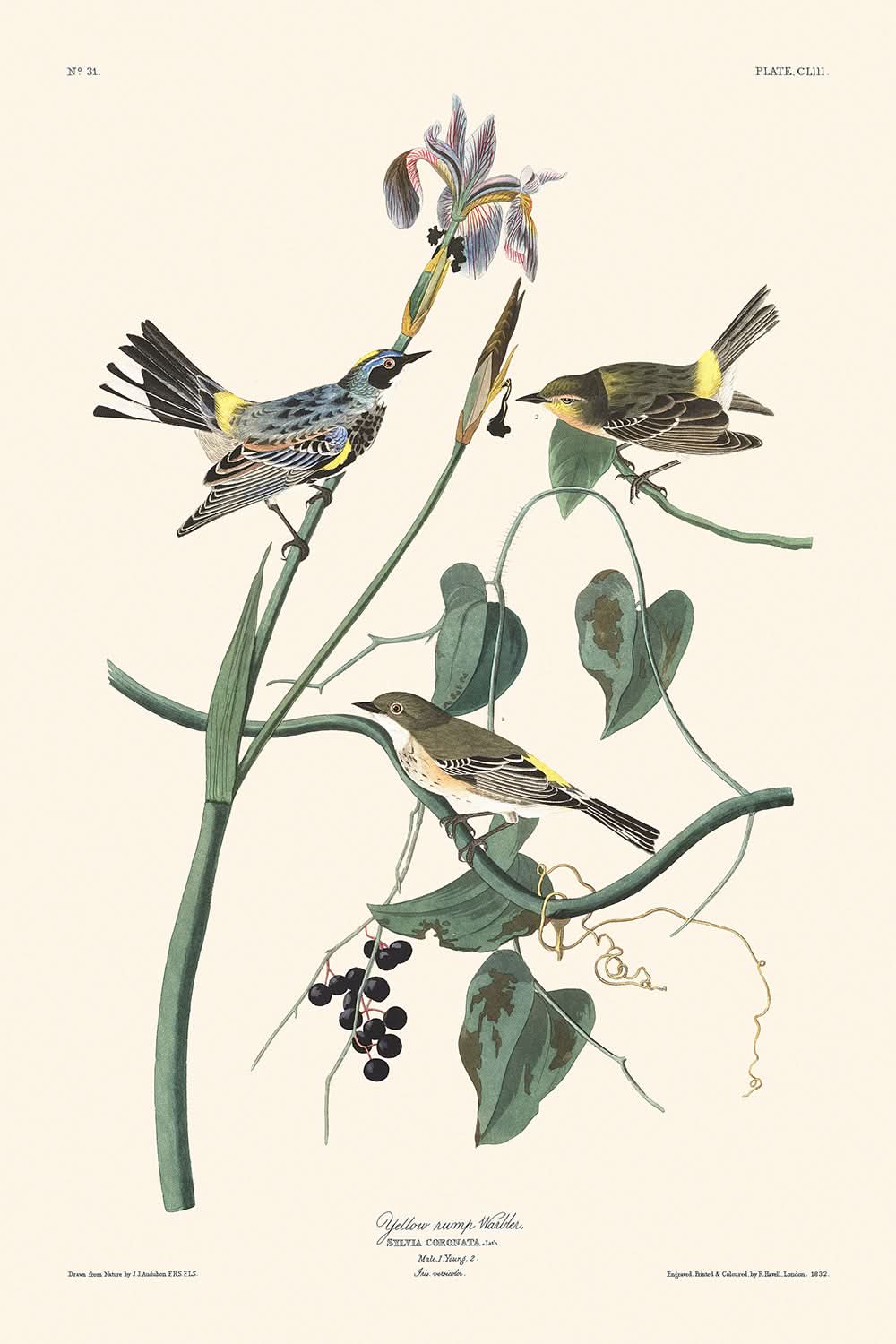 The "Yellow-crown Warbler," or Sylvia coronata, depicted within this artwork is notable for its vivid observation of the bird’s migration and social behavior. Audubon’s illustration captures the bird in full summer plumage, highlighting its vibrant yellows and nuanced greys, offering a unique insight into its life cycle and habits. Collectors and nature enthusiasts alike will appreciate the attention to detail, from the bird’s delicate form to its picturesque surroundings.