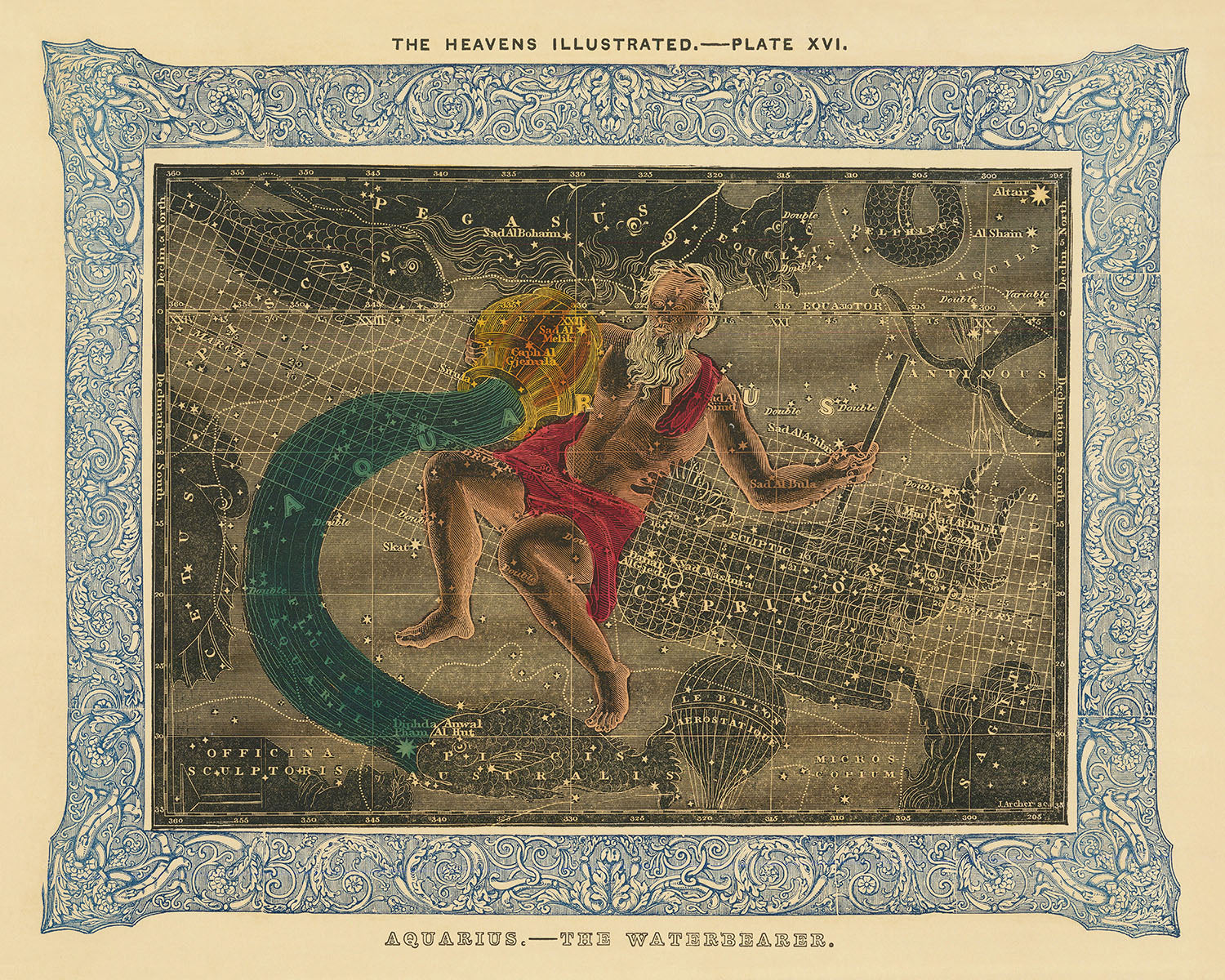 Duncan Bradford, the mastermind behind this captivating piece, is celebrated for his contributions to astronomy through detailed illustrations and comprehensive geographical works. His collaboration with engravers James Archer and George W. Boynton resulted in the stunning visuals seen in "The Wonders of the Heavens." This particular chart, depicting Aquarius, stands out due to its vibrant colour use and the delicate artistry involved in the hand colouring process, making it a true collector's item.