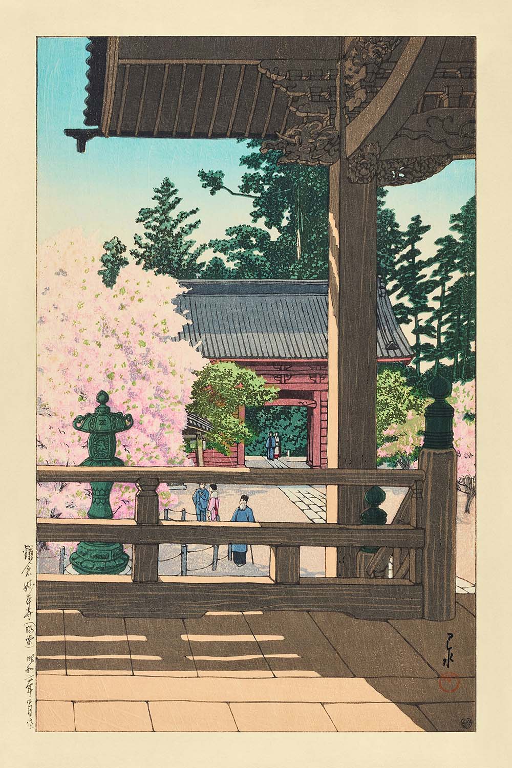 This particular woodblock print stands out for its exquisite depiction of blooming cherry trees arching alongside a peaceful temple path, swathed in radiant shades of pink, hints of crimson red, and the layered, verdant green foliage. The blossom-laden branches form a soft, enveloping canopy, contrasted by a weathered torii gate and sloping red rooftops, evoking an atmosphere of calm contemplation. Hasui’s expert use of subtle gradients, varying line weights, and delicate textural detail masterfully communicates the poetic impermanence of cherry blossoms—a recurring theme in Japanese aesthetics.