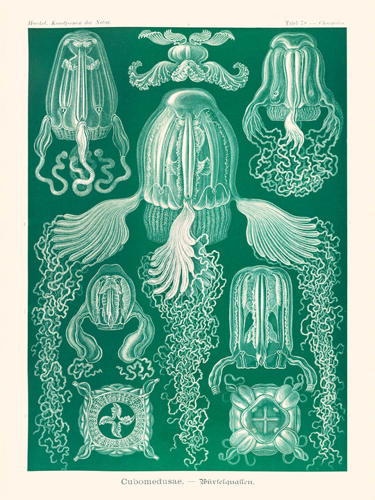 Ernst Haeckel was a distinguished German biologist, naturalist, and illustrator who significantly contributed to the understanding of marine biology and evolutionary theory. His "Kunstformen der Natur" is celebrated for its stunning illustrations that bridge the gap between science and art. The "Cubomedusae Würfelquallen" illustration is an exemplary piece showcasing his delicate line work and vibrant color palette. The artwork primarily features hues of luminescent greens, fiery reds, and cool blues, meticulously rendering the ethereal jellyfish with their trailing tentacles and translucent bodies.
