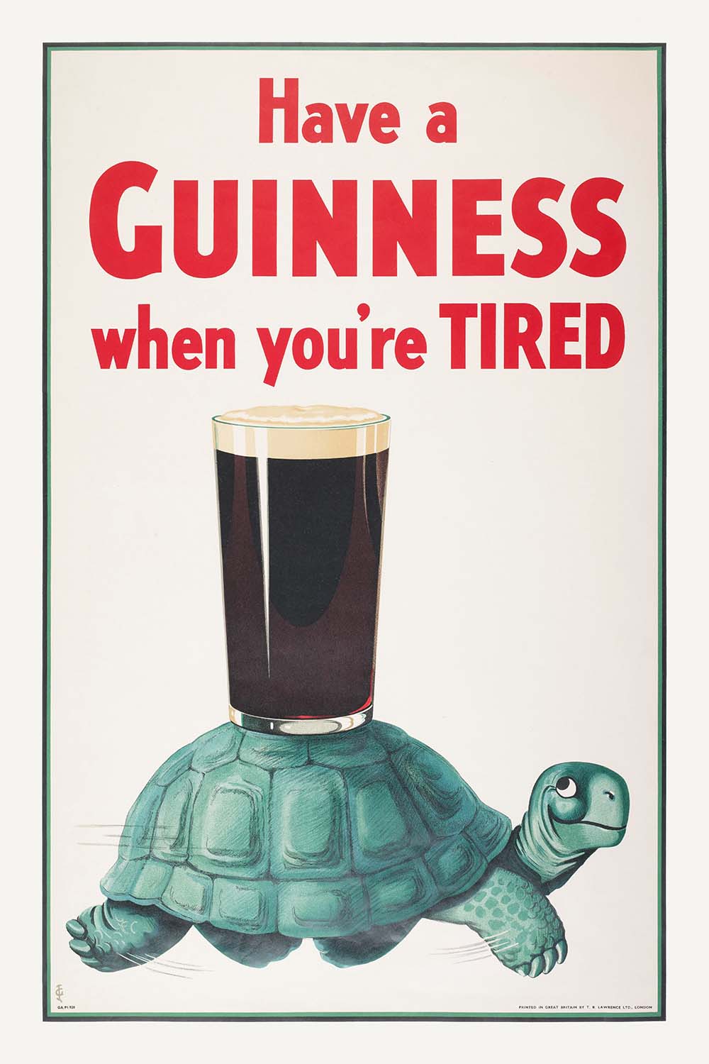 “Have a Guinness When You’re Tired” by John Gilroy is a charming and playful example of vintage advertising art, first published in 1936. Created as a colour lithograph poster, this iconic piece was part of the celebrated Guinness advertising campaign designed by the renowned commercial artist John Gilroy for the agency S H Benson Ltd. The poster features the memorable image of a glass of Guinness balanced serenely atop the shell of a tortoise, accompanied by the inviting slogan, “Have a Guinness when you’re tired.” This witty juxtaposition of the slow-moving tortoise with the promise of refreshment and revitalization encapsulates the clever, whimsical spirit that made Gilroy’s Guinness posters so beloved.