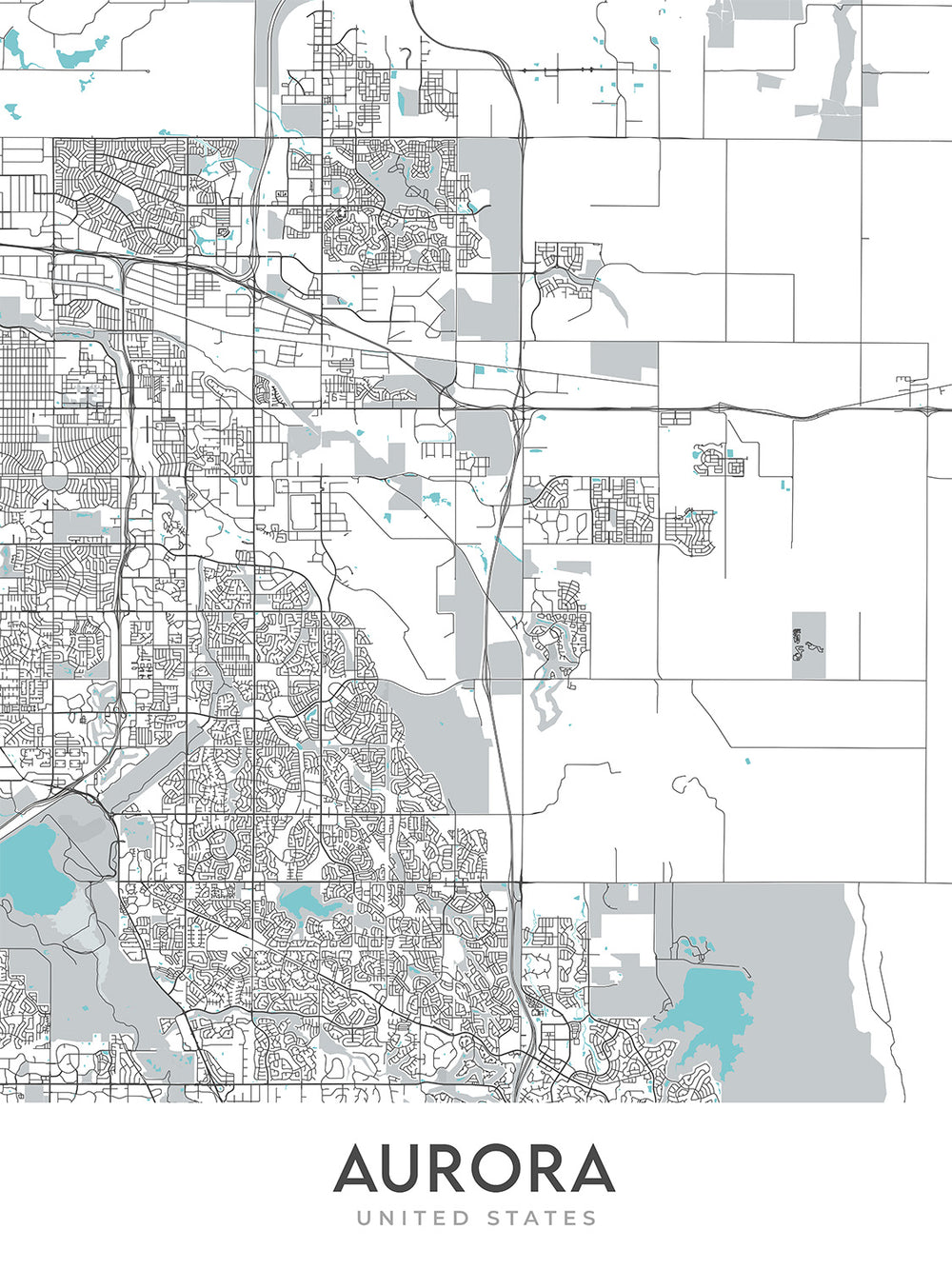 This map of Aurora, Colorado, is a modern, detailed street map without labels, perfect for adding a touch of contemporary style to your home décor. The map covers a generous area, encompassing a wide range of neighborhoods, major roads, and landmarks, all rendered in a visually striking and easy-to-read format.
