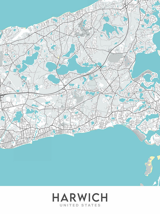 This map of Harwich, Massachusetts, is a modern, detailed street map without labels. The map covers an area of approximately 9 miles east to west and 11 miles north to south, with the city centre roughly in the middle. This means the map extends approximately 4.5 miles to the west of the centre point, and 4.5 miles to the east of the centre point. The map extends roughly 5.5 miles to the north of the centre point, and 5.5 miles to the south of the centre point.