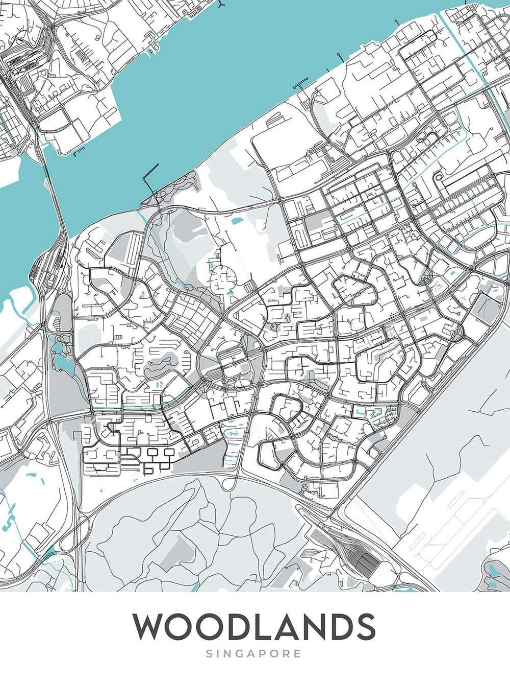 The "Woodlands" map by The Unique Maps Co. is a captivating portrayal of one of Singapore's dynamic neighborhoods, known for its lush landscapes and bustling community life. This modern detailed street map captures the essence of Woodlands, offering a glimpse into its well-planned streets and diverse areas without the clutter of labels. The map's focus on this neighborhood highlights its residential zones, educational institutions, and vibrant public spaces, making it not only a functional piece of art but also a fascinating visual exploration of the area. The absence of labels enhances the aesthetic appeal, inviting viewers to appreciate the clean lines and structured layout that define modern cartography.