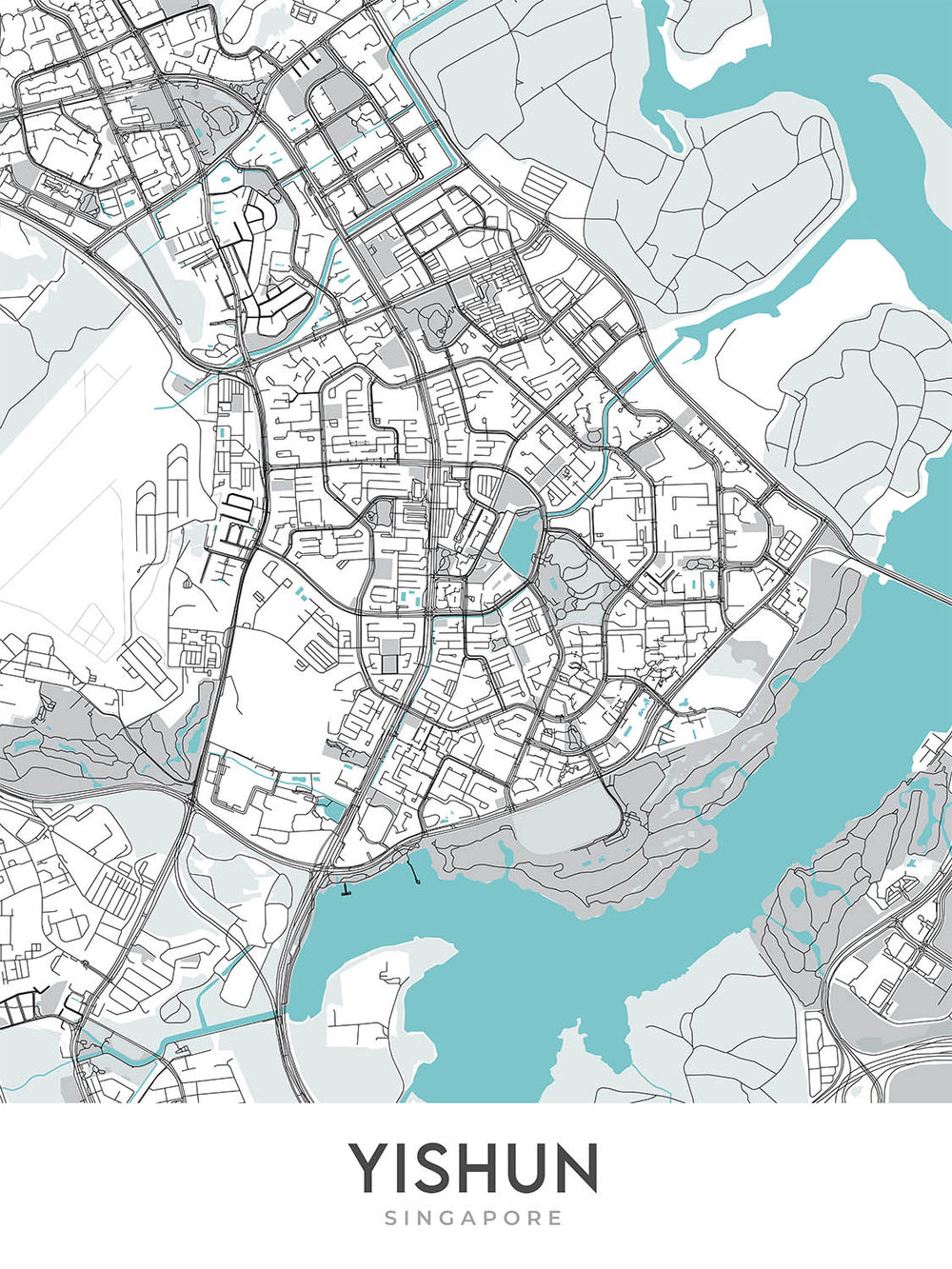 Lastly, the map is a testament to the craftsmanship and artistic vision of The Unique Maps Co., reflecting their commitment to creating not just maps, but keepsakes. This map of Yishun is more than just a piece of decor; it is a blend of art, memory, and invitation, all rolled into one. It stands as a symbol of how modern cartography can bridge the gap between functional mapping and aesthetic design, making it a perfect addition to any interior decor scheme that values elegance and understated sophistication.