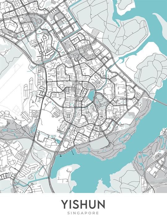In the neighborhood of Yishun, one finds a delightful blend of natural beauty and urban convenience, aspects that are subtly underscored in this map's design. The inclusion of significant landmarks like Khoo Teck Puat Hospital and Lower Seletar Reservoir Park offers a nod to the neighborhood’s diverse offerings. These landmarks are depicted not with words, but with careful cartographic distinctions that beckon the onlooker to a closer inspection, making the map both a discovery tool and a decorative element. The map’s artful abstraction invites imagination about what each area has to offer, turning a simple glance at a wall into a moment of urban exploration.