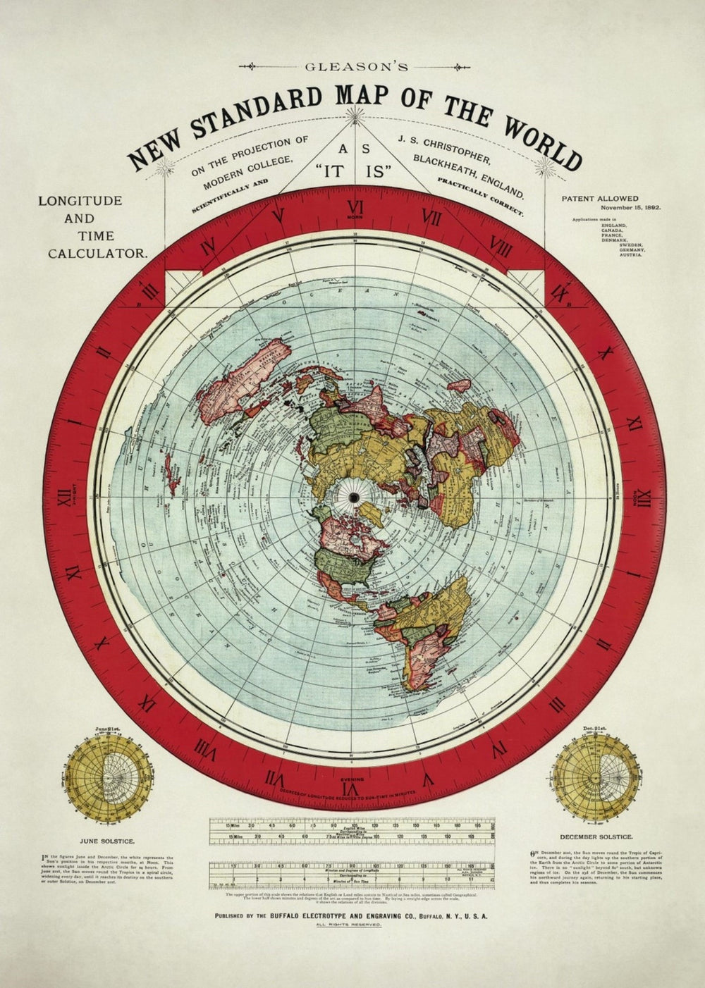 Published in 1892, the creator of this map, Alexander Gleason, also believed that the world was flat. Though there was no evidence for this, he even wrote 'SCIENTIFICALLY AND PRACTICALLY CORRECT' at the top of the map. This quite a smart map - the numbers around the outside of the central disc show that longitude and time zones can be calculated quite simply by flattening the globe.