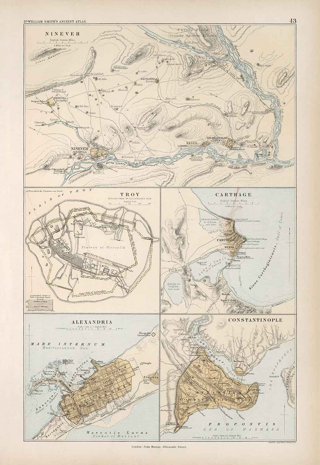 This city plan map covers five great and ancient cities in North Africa and the Middle East: Constantinople, now known as Istanbul, Alexandria, Carthage, Troy, known today as Hisarlik and Nineveh, known today as Mosul.