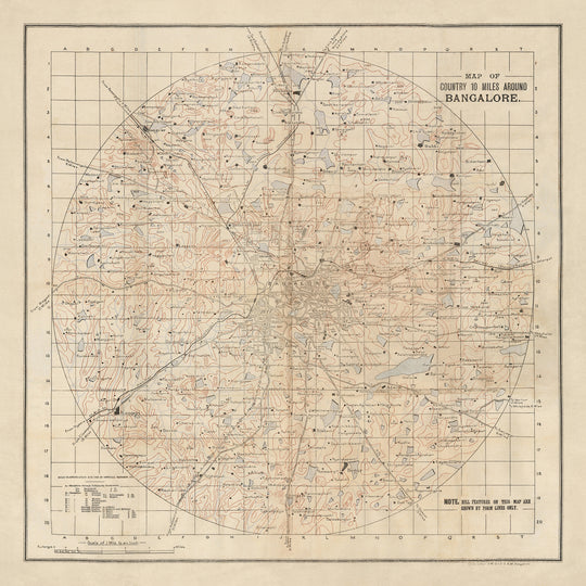 The "Map of Country 10 Miles Around Bangalore," created in 1910 by an anonymous cartographer, offers a captivating glimpse into the historical landscape of Bangalore and its surrounding regions. This meticulously detailed city street map, printed by the Litho. School 2nd Q.V.O.S. & M in Bangalore, reflects the cartographic precision and aesthetic sensibilities of the early 20th century. As you explore this map, you will uncover the intricate network of roads, the varied topography marked by contour lines, and the numerous settlements that paint a vivid picture of Bangalore's past.