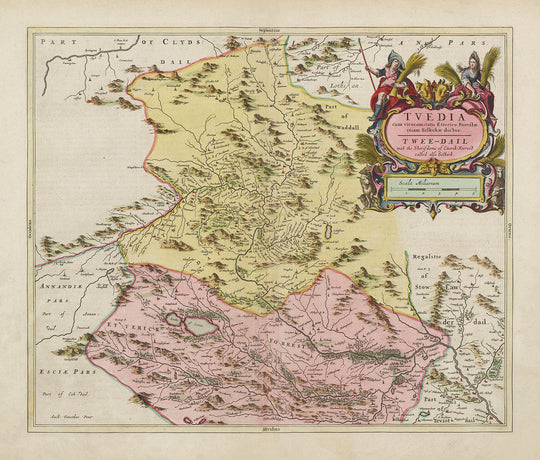 This exceedingly rare, old full colour map of the county of Selkirk in Scotland was created by master mapmaker Joan Blaeu from his workshop in Amsterdam and originally published in 1665 as part of his Theatrum Orbis Terrarum Sive Atlas Novus.
