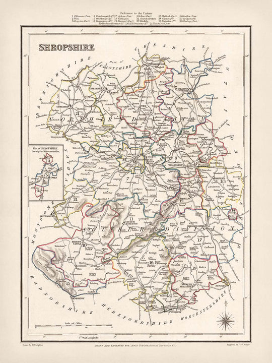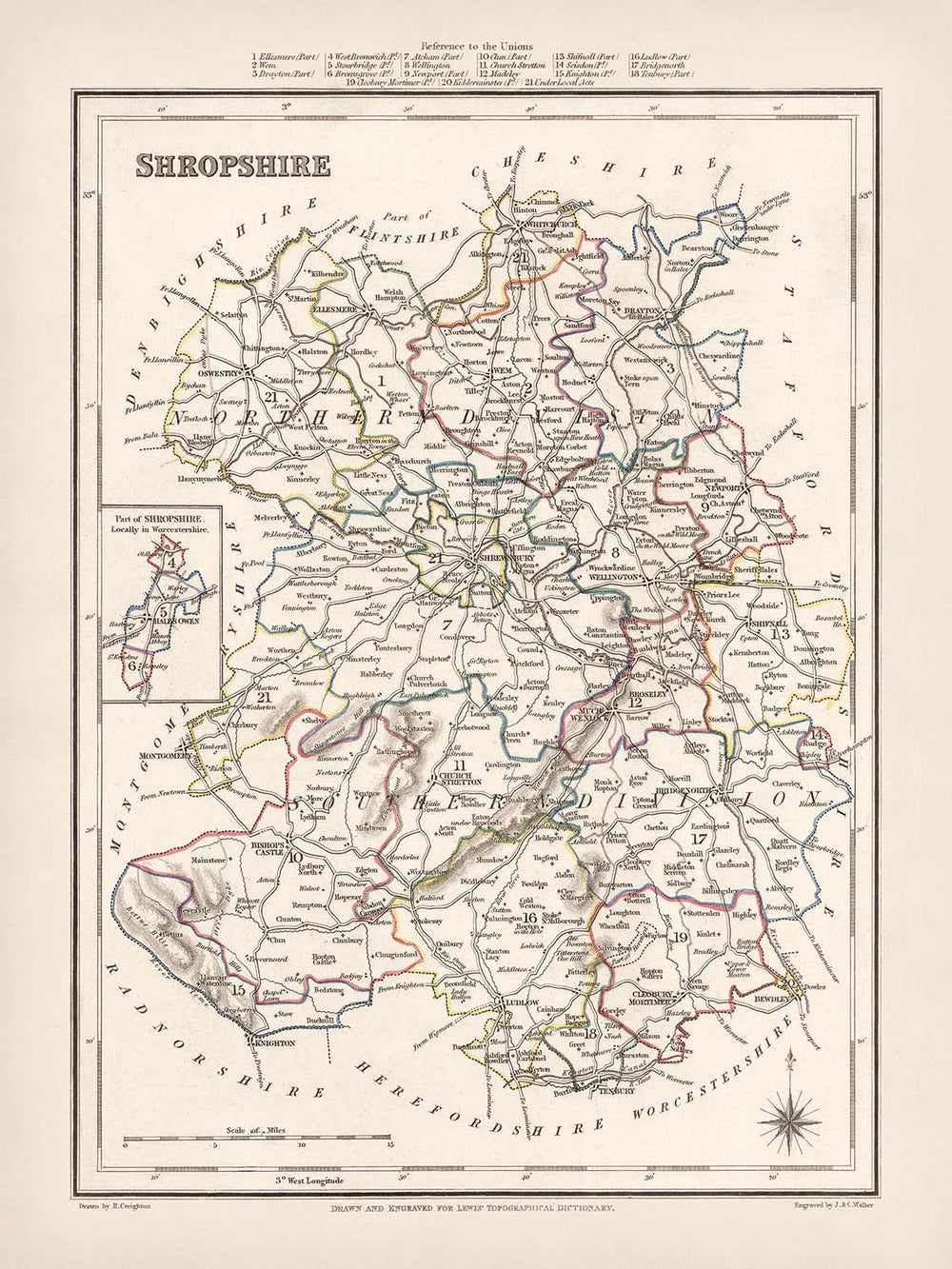 Dive into the grandeur of Shropshire's past with this splendid 1844 map by Samuel Lewis. Celebrate the rich history of one of England's most picturesque counties, intricately charted on a canvas that captures the essence of the era. This carefully preserved map not only embodies the precision and detail of 19th century cartography but also provides a fascinating insight into the evolving landscape of a county that has been the setting for a tapestry of historical events.