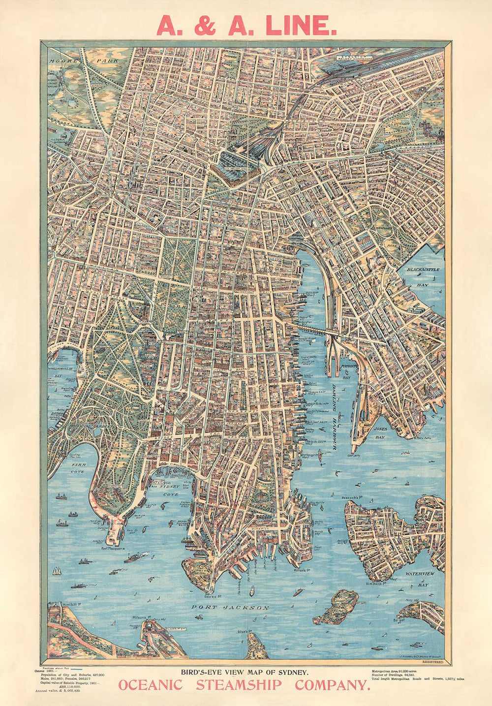 The 'eye' of this birds eye view of Sydney is somewhere above Port Jackson/Sydney Harbour bay, looking in a southerly direction towards the oldest and most built up parts of the city. Sydney Cove, Darling Habour, Woolloomooloo Bay and Blackwattle Bay can all be seen.