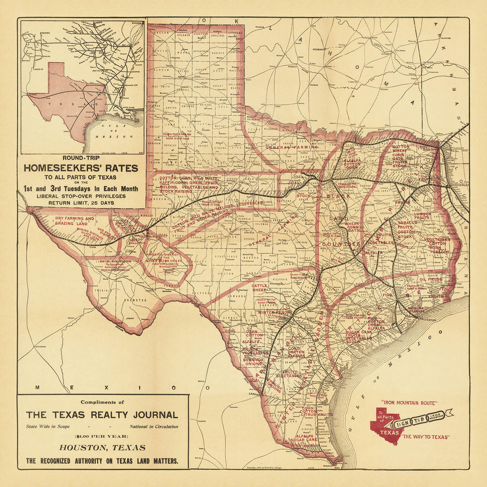 - Name of the map: Iron Mountain Route to All Parts of Texas - Round-Trip Homeseekers' Rates to All parts of Texas.