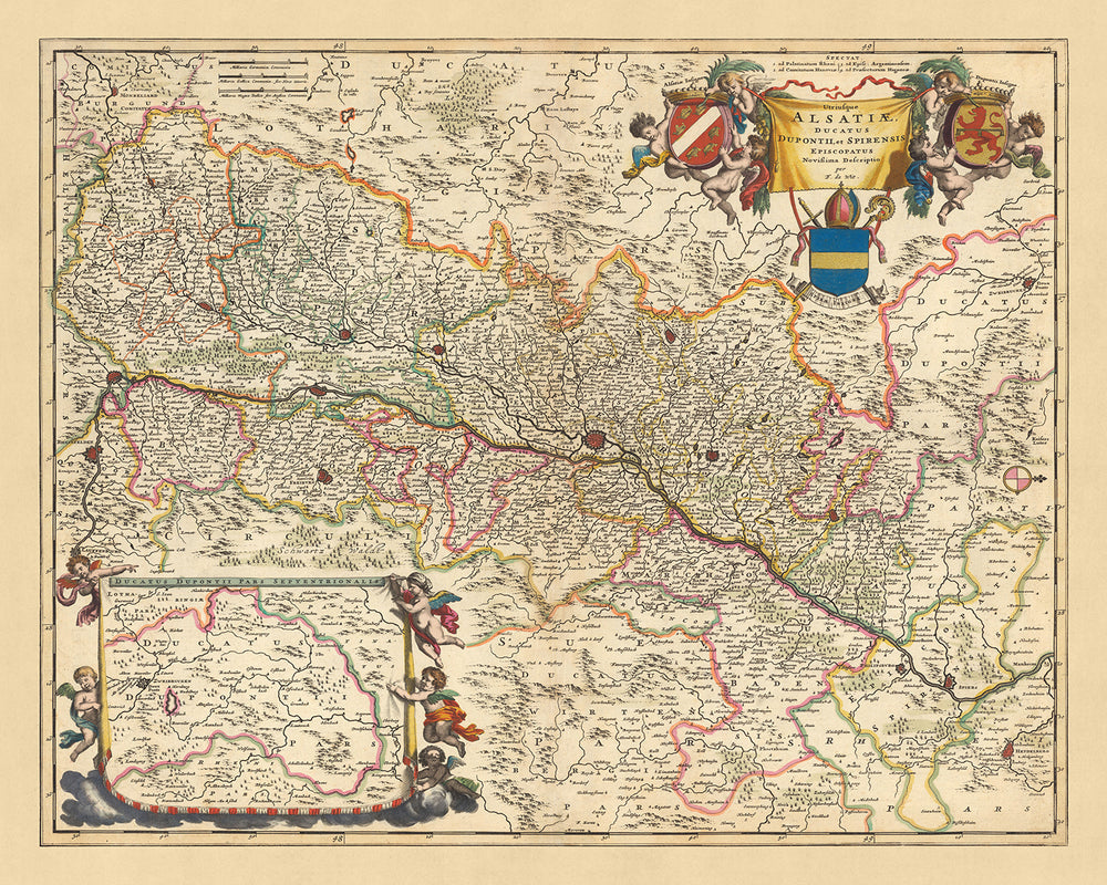 Old Map of The Alsaces, Duchy of Zweibrücken & Bishopric of Speyer by Visscher, 1690: Strasbourg, Freiburg im Breisgau, Karlsruhe, Mannheim, Basel