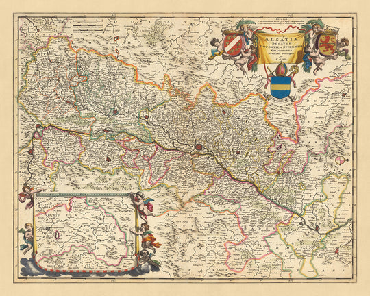 Immerse yourself in the historical intricacies of 'Utriusque Alsatiae, Ducatus Dupontii et Spirensis Episcopatus', a remarkable map crafted by Nicolaes Visscher II in 1690. This masterpiece of cartography captures the regions and political divisions of The Alsaces and Duchy of Zweibrücken & Bishopric of Speyer, areas now part of modern-day France and Germany. The full name of the map translates to 'Both Alsaces, Duchy of Zweibrücken and Bishopric of Speyer', providing a clear understanding of the territories it encompasses.