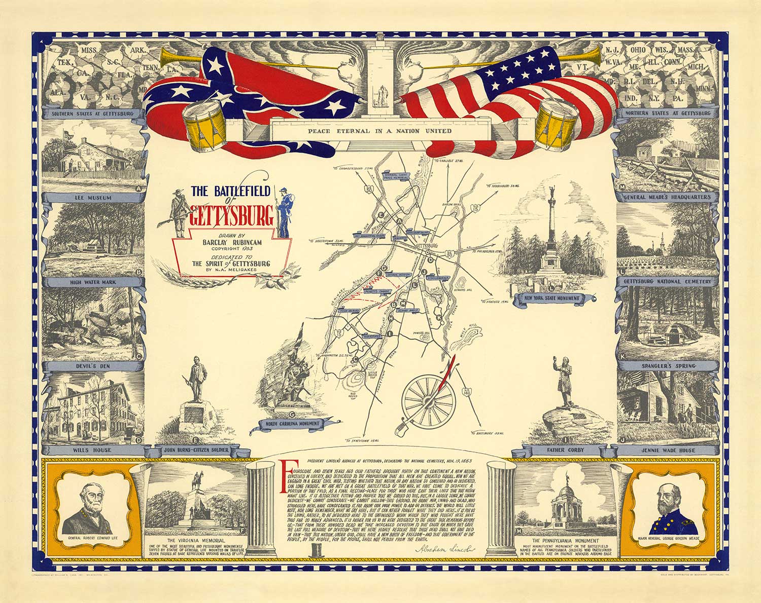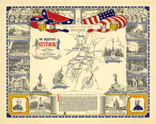Surrounding the map are landmarks of Gettysburg, such as General Meade's, Spangler Square, and the Gettysburg National Cemetery.