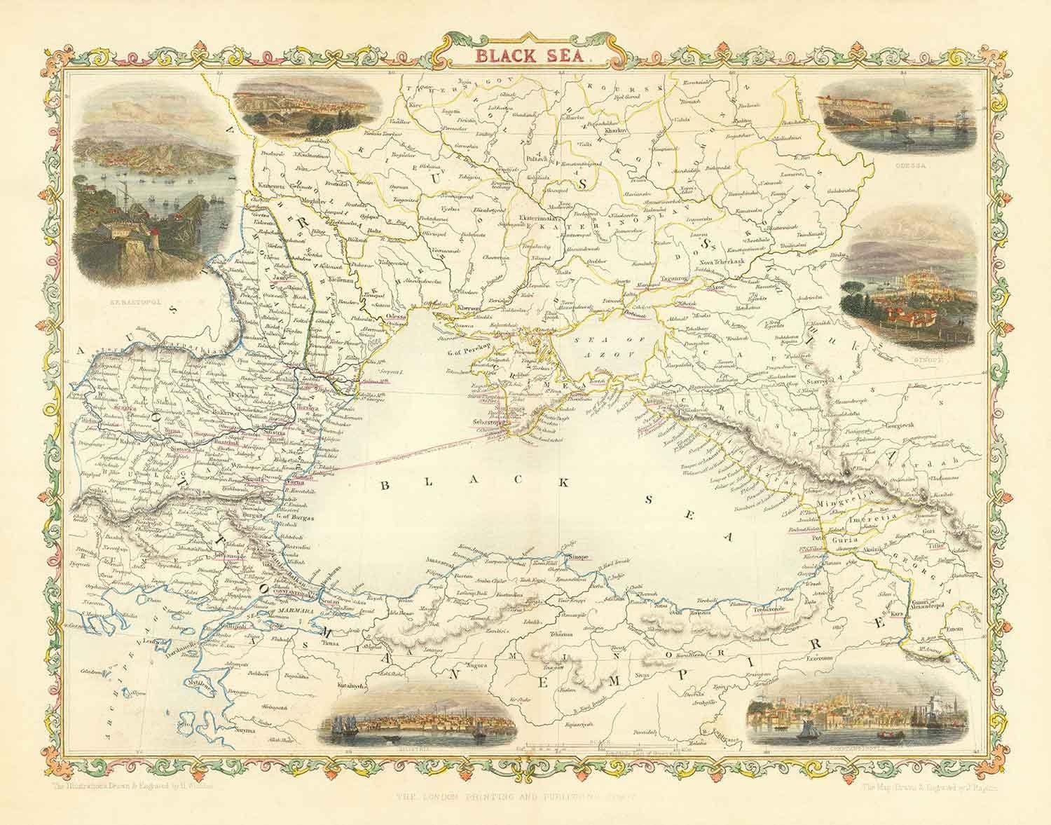 Engraved by John Rapkin and published by J. Tallis & Co in 1854, this is one of the finest and most detailed historic maps of the Black Sea region with Europe on the left and Asia on the right.