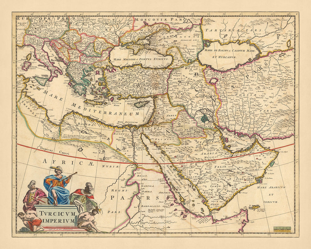 The 'Turcicum imperium' is not merely a map, but a vibrant canvas that paints a vivid picture of the world as it was known in 1690. It showcases significant cities, regions, and landmarks of the time, from the bustling Mediterranean Sea to the tranquil Red Sea. The map's intricacy extends to the depiction of political and administrative boundaries, waterways, canals, and even landmarks. It brings to life the grandeur of the Ottoman Empire, extending north to Hungary and Circassia, east to Persia, and encompassing the entirety of the Arabian Peninsula.