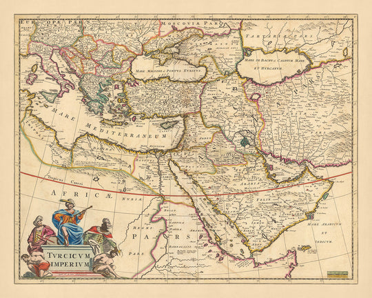 Behold the majesty of 'Turcicum imperium', a captivating historical map that takes you back to the Ottoman Empire's expanse in the late 17th century. Crafted by the esteemed Nicolaes Visscher II, this map is a testament to the Dutch Golden Age's exceptional cartographic skills. The grandson of Claes Janszoon Visscher, one of the finest mapmakers of his time, Nicolaes Visscher II, imbued this map with an attention to detail and accuracy that was characteristic of his lineage. Translated to 'The Turkish Empire', this map encapsulates the vast territories of the Ottoman Empire, spanning from the Middle East to Southern Europe and Northeast Africa.