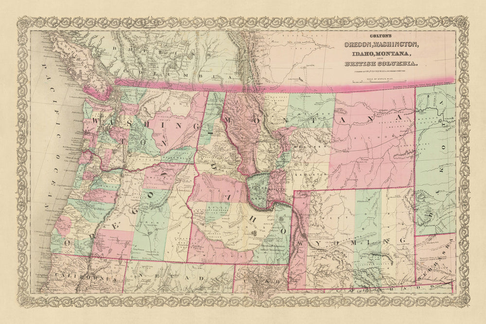 Old Map of the Pacific Northwest by J. H. Colton, 1868: Portland, Seattle, Boise, Helena, Cheyenne