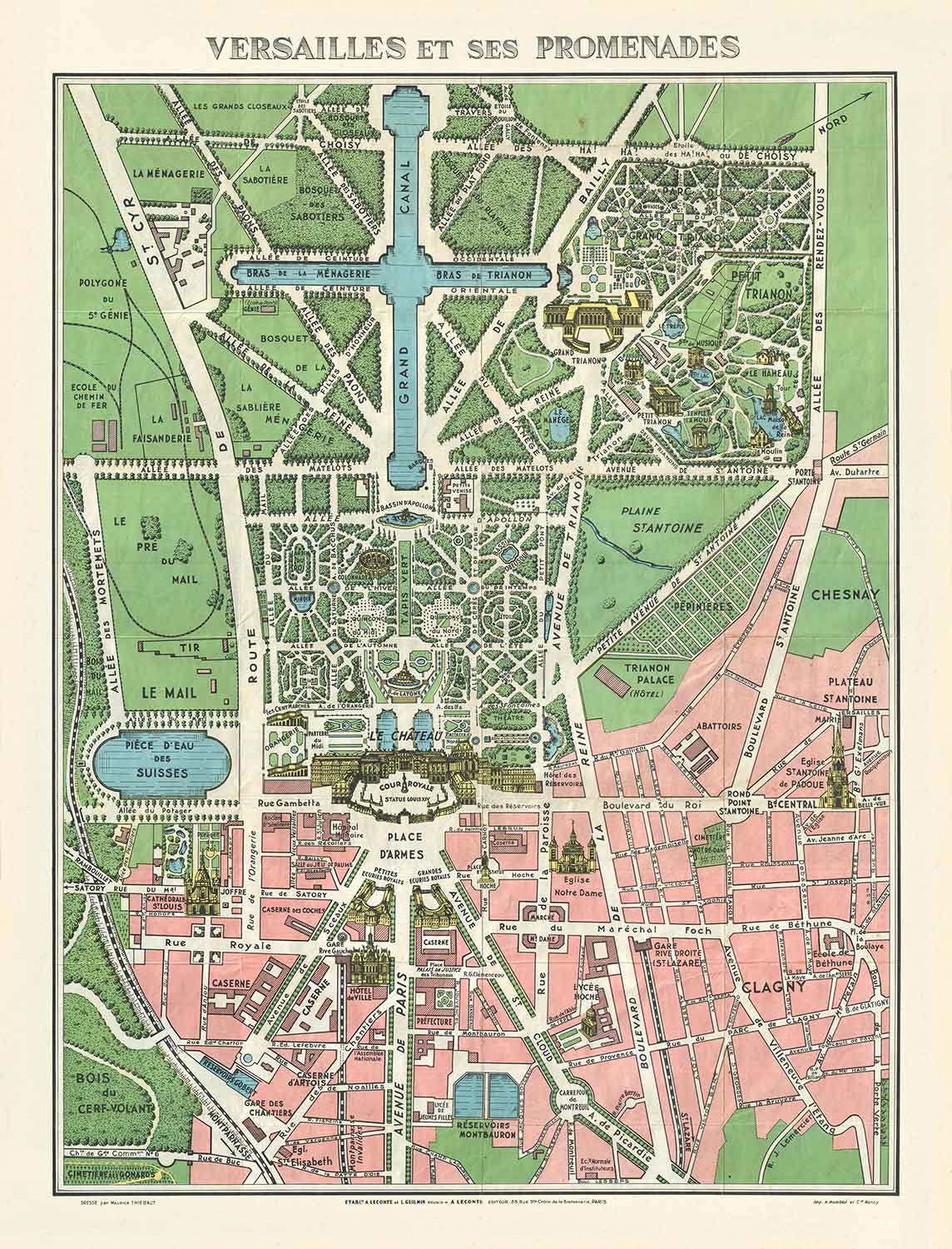 A very colourful map which demonstrates the massive size and grandeur of Versailles. As a former royal residence constructed between 1631 and 1634 by King Louis XIV, it is known today for its garden, architecture and water features (including musical garden shows). It is one of the most visited sites in France.