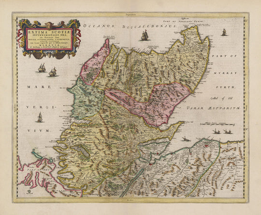 This exceedingly rare, old full colour map of the Scottish Highlands was created by master mapmaker Joan Blaeu from his workshop in Amsterdam and originally published in 1665 as part of his Theatrum Orbis Terrarum Sive Atlas Novus.