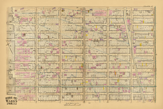 Welcome to a fascinating glimpse into the past with this detailed 1879 map of the Theater District, part of wards 20 & 22, in New York City, meticulously crafted by G.W. Bromley. This hand-colored lithographed map is not just a navigational aid but a historical document that provides a unique insight into the urban landscape of New York City at the close of the 19th century. The map meticulously marks buildings, fire hydrants, steam and street railways, and even the original water courses and farm lines that predate the city's modern grid.
